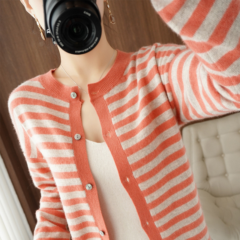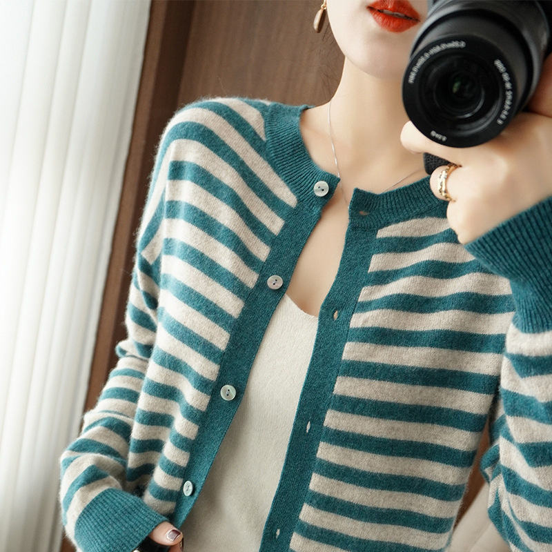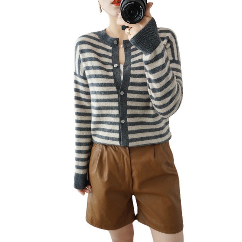 23 Autumn And Winter Cashmere Cardigan Women's Striped Knitted Jacket Slim Sweater Loose Pure Wool Outerwear Top