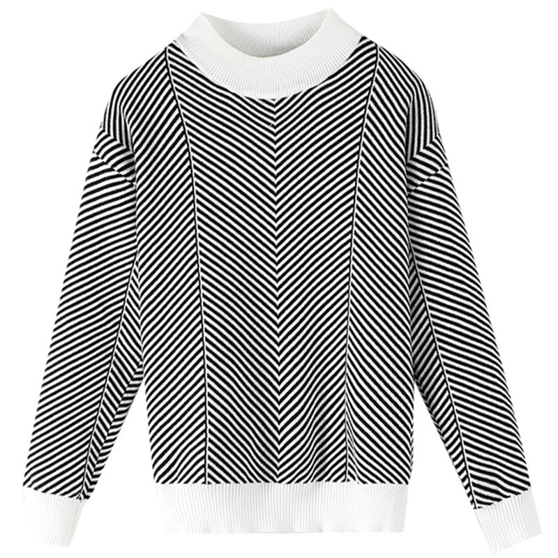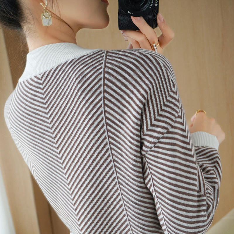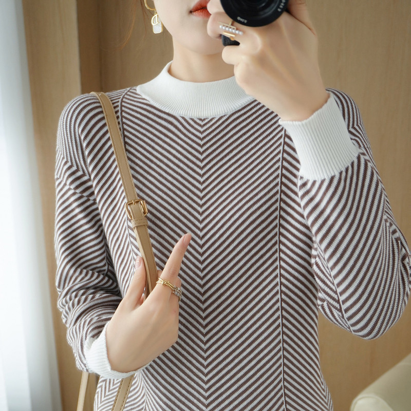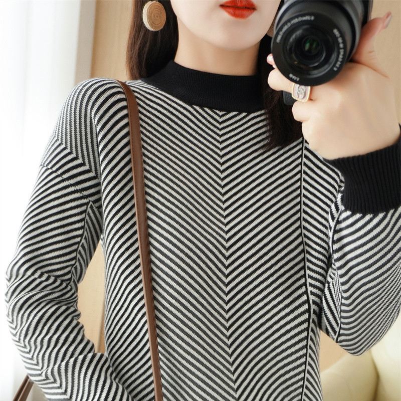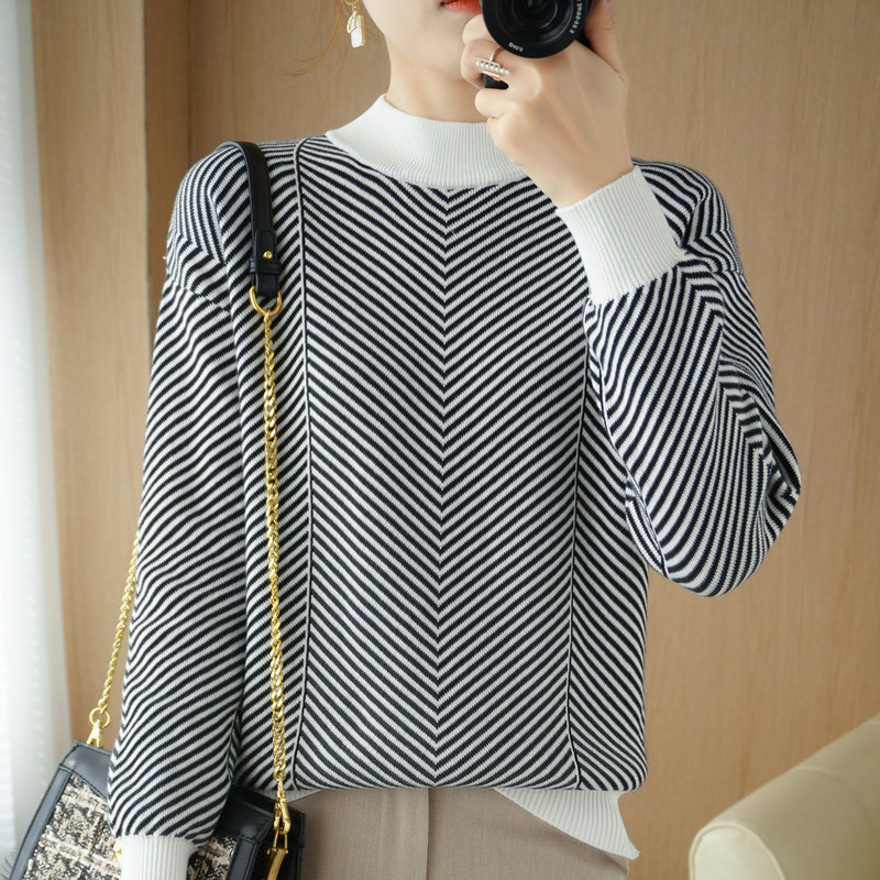22 Autumn And Winter Contrast Striped Long-sleeved Cotton Sweater For Women With Half-high Collar Loose Pullover Cotton Bottoming Shirt Top