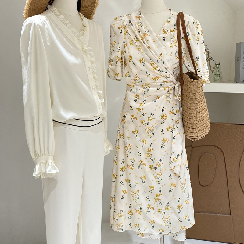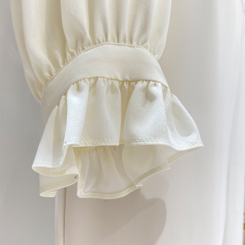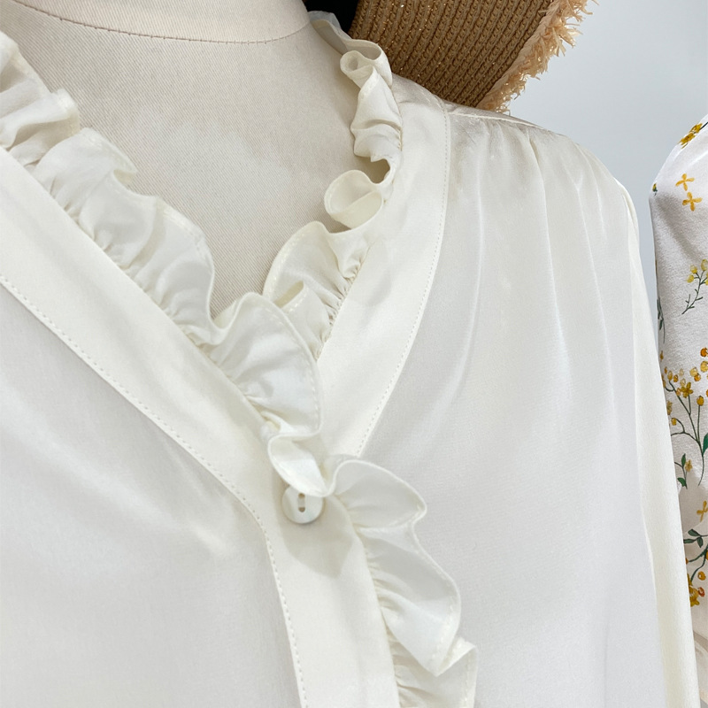 Silk Shirt Women Early Spring French Double Crepe Shirt White Commuter Lace100%Mulberry Silk Top