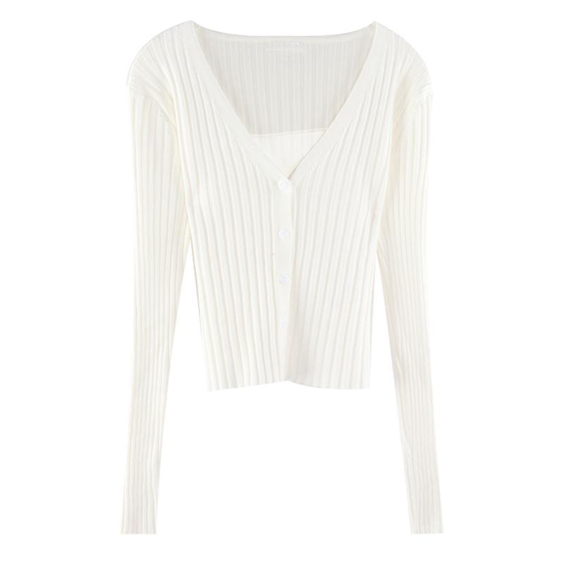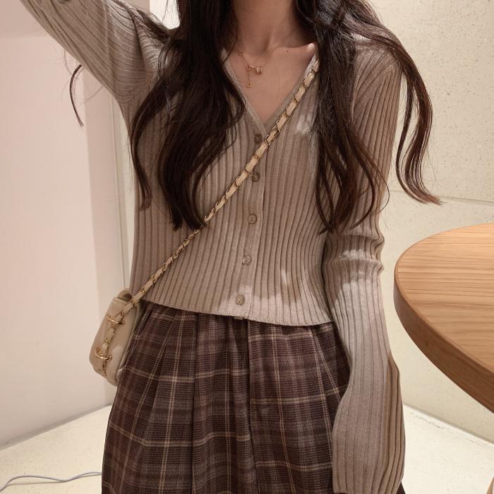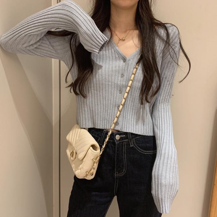 Spring Korean Retro V-neck Solid Color Short Slim Top Long Sleeve Knitted Cardigan Sweater Women's