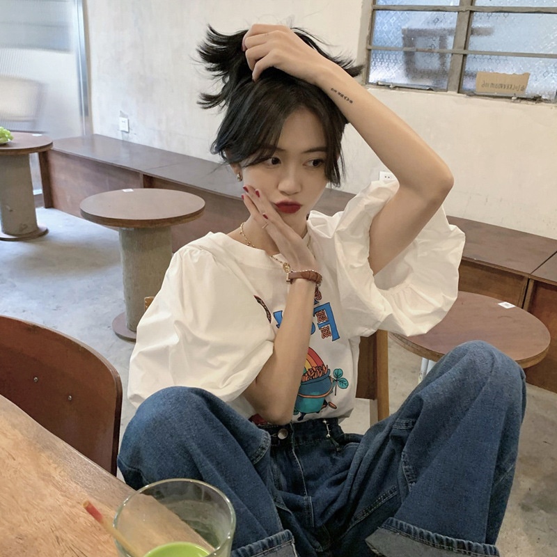 Cartoon Puff Sleeve T-shirt Summer Korean Version Printing Loose Western-style Short-sleeved Tops For Women
