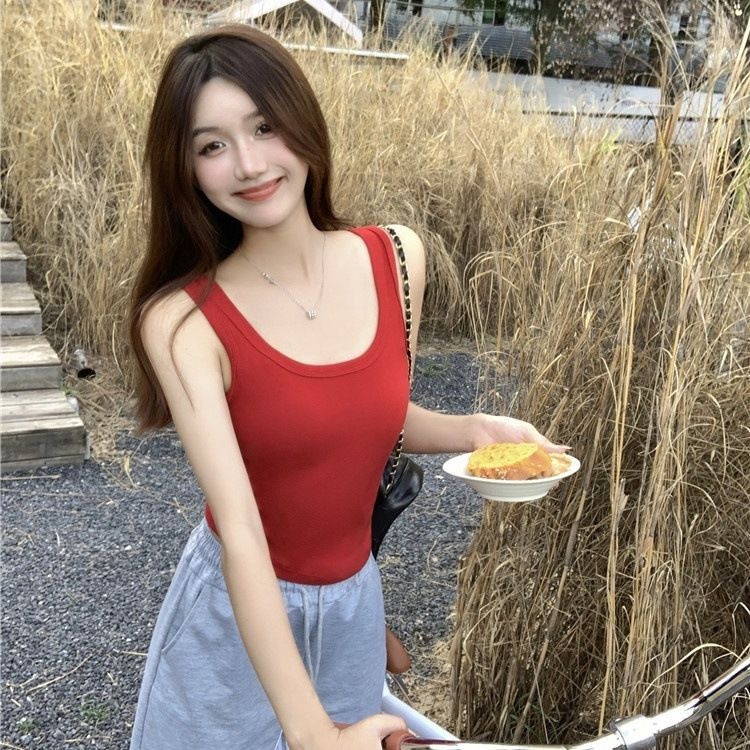 French Sexy Hot Girl Hollow Cotton Camisole With Chest Pads Slim Short Beautiful Back Bottoming Shirt Tops Women's