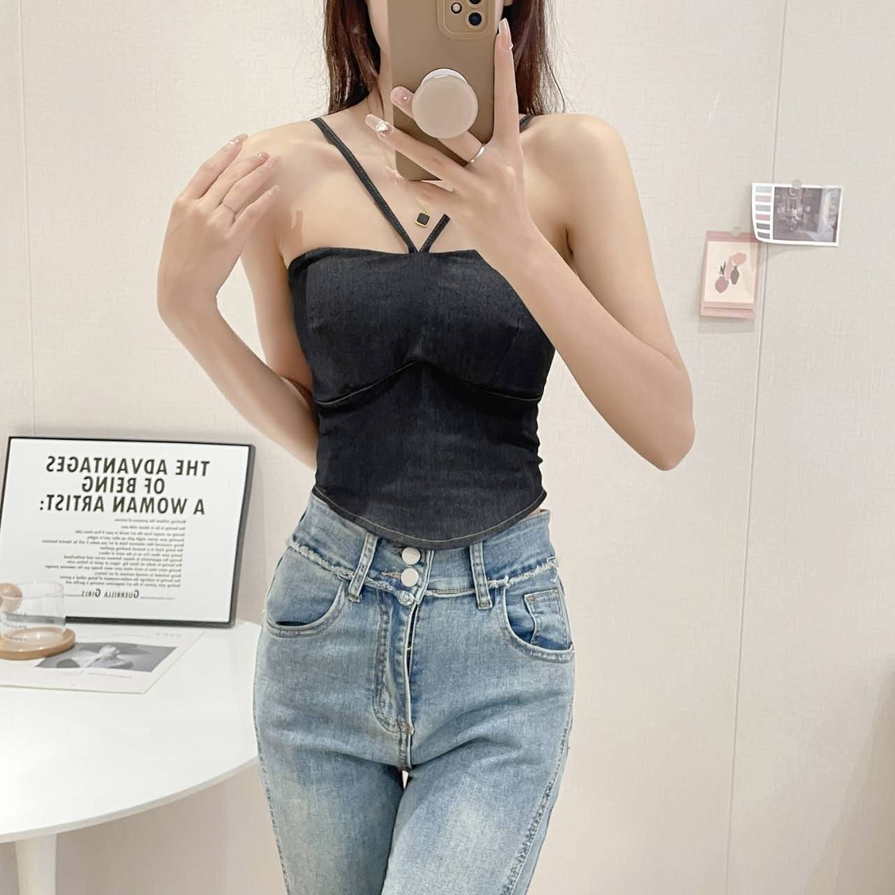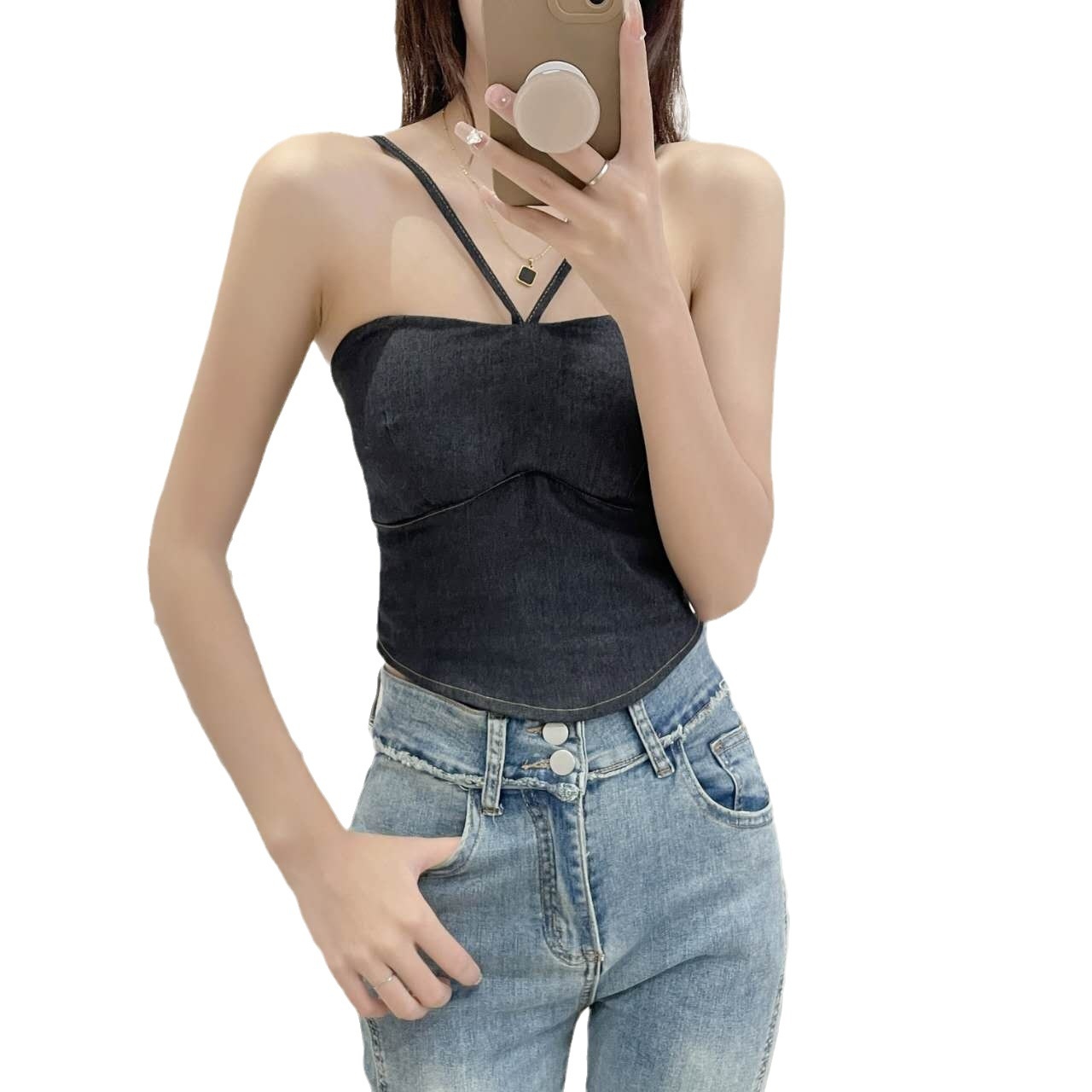 Korean Denim Camisole Top,Versatile,Niche Design,Beautiful Back,Sleeveless,Halter Neck,Padded Top