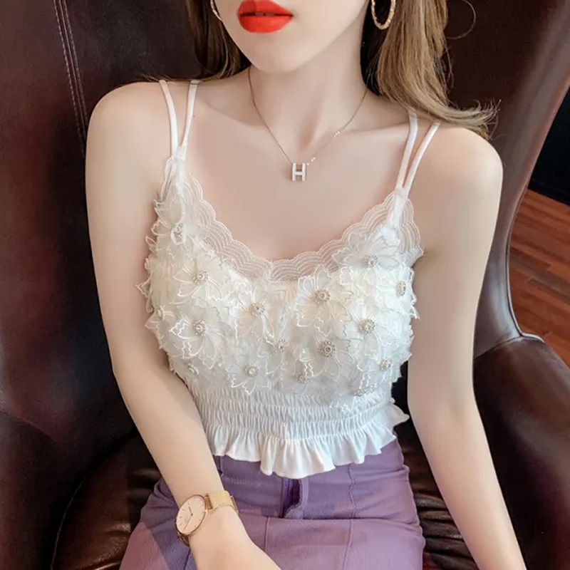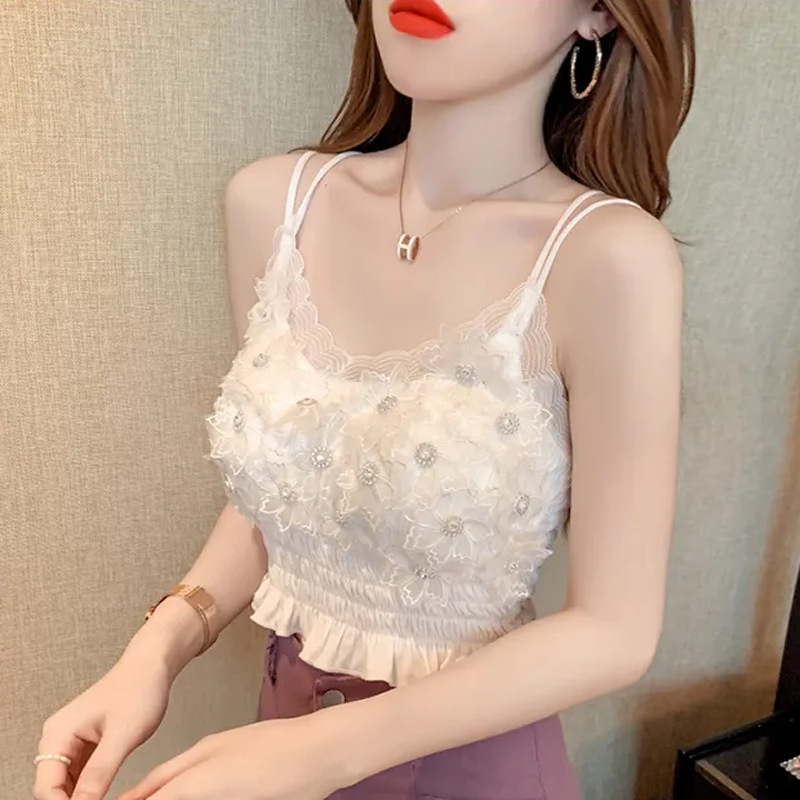 Diamond Flower Thin Camisole Women French Milky Chic Outfit Outerwear With Chest Pad Hot Girls Chest Wrap