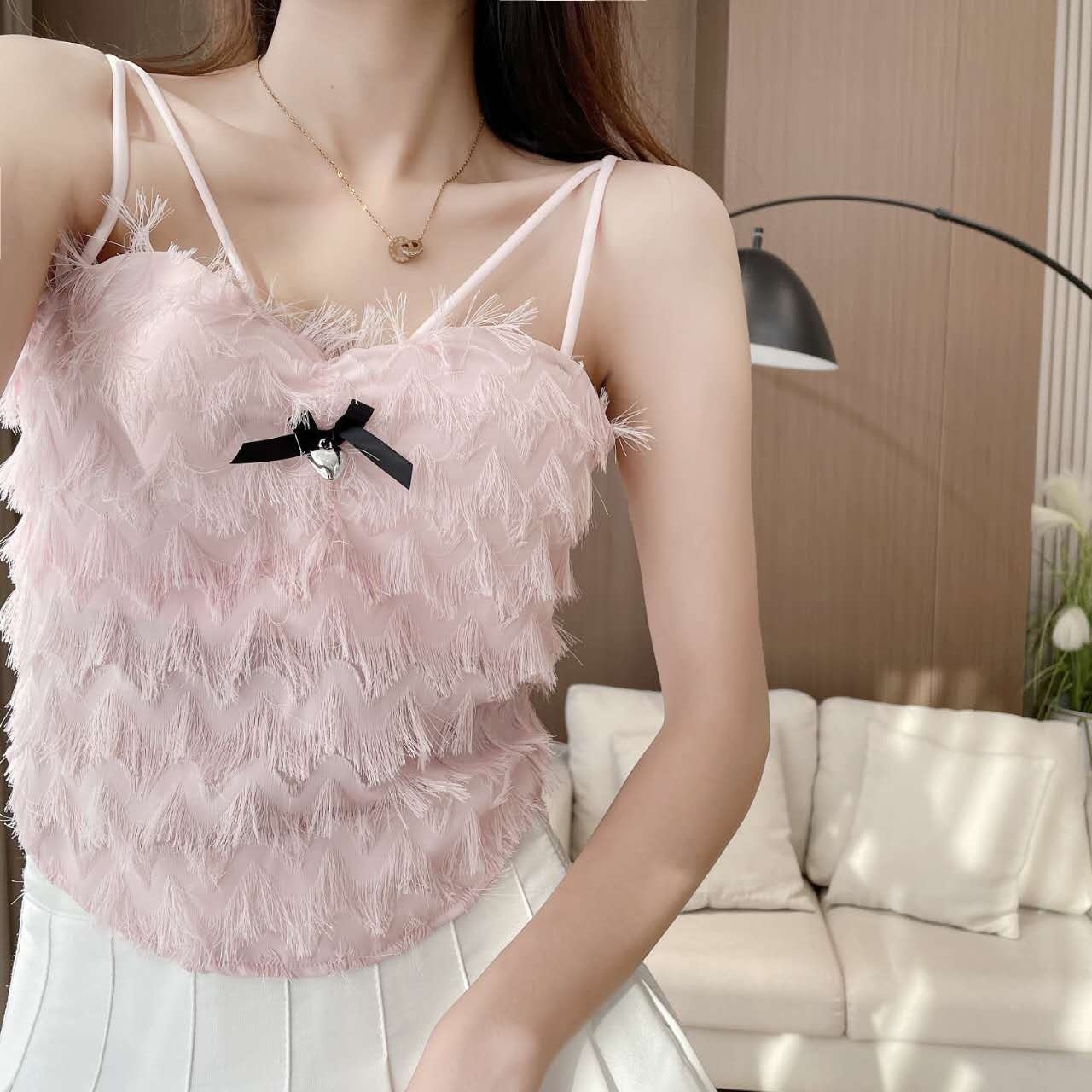 Hot Girl Plush Tassel Bow Camisole With Chest Pad For Women,Pleated Beautiful Back,Outer Wear Design Top
