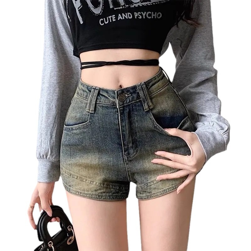 Small American Retro Old Denim Shorts For Women Summer Hot Girl High Waist Straight Wide Leg Slim A-line Pants