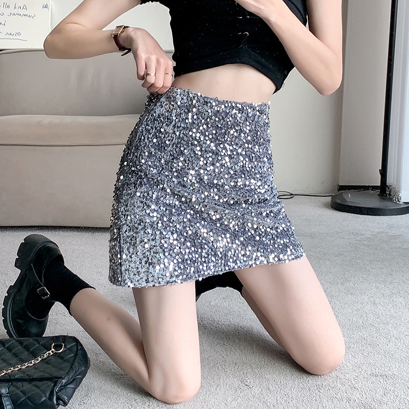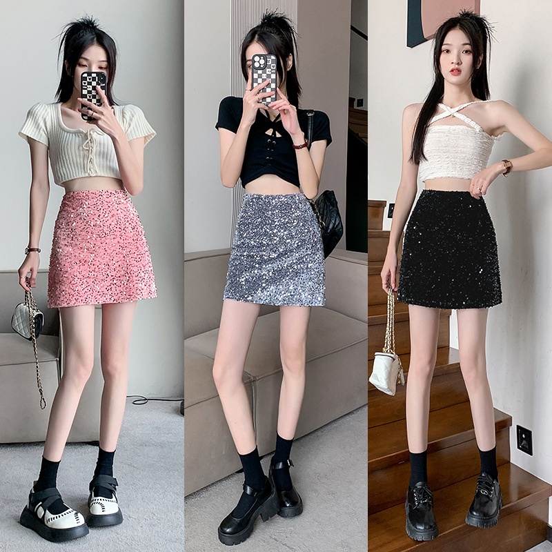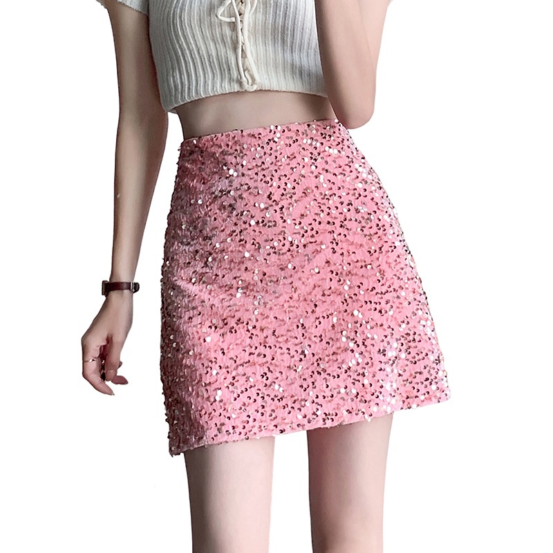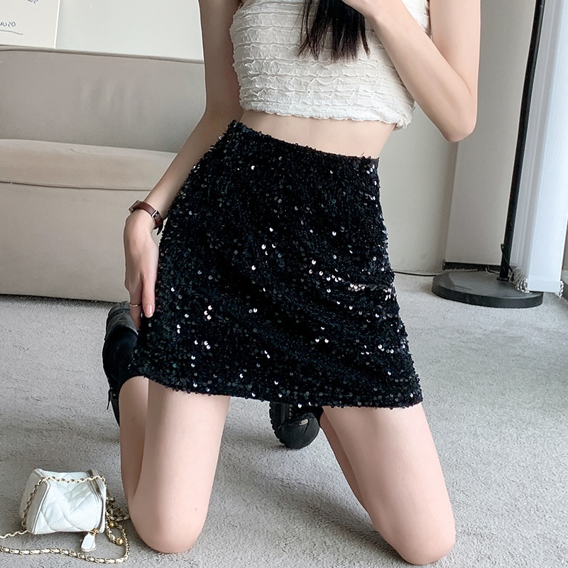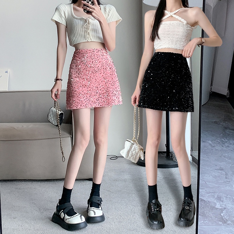 Real Shot Hot Girl Elastic Waist Sequined Skirt Female Summer Petite High Waist A-line Short Skirt Sexy Skirt
