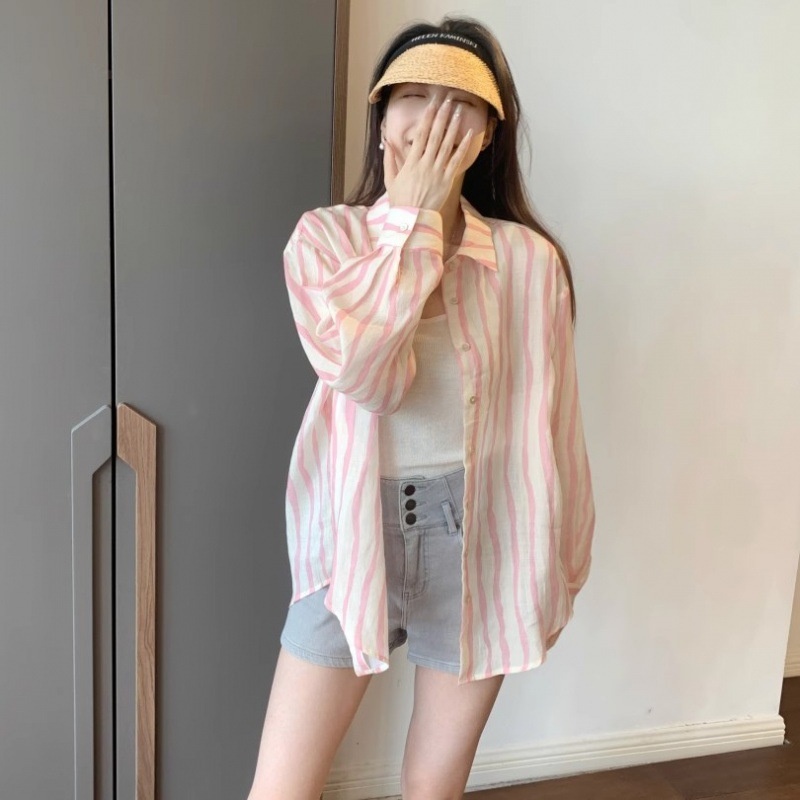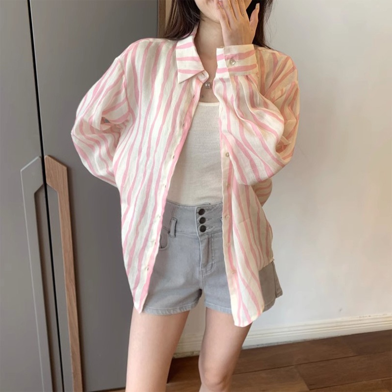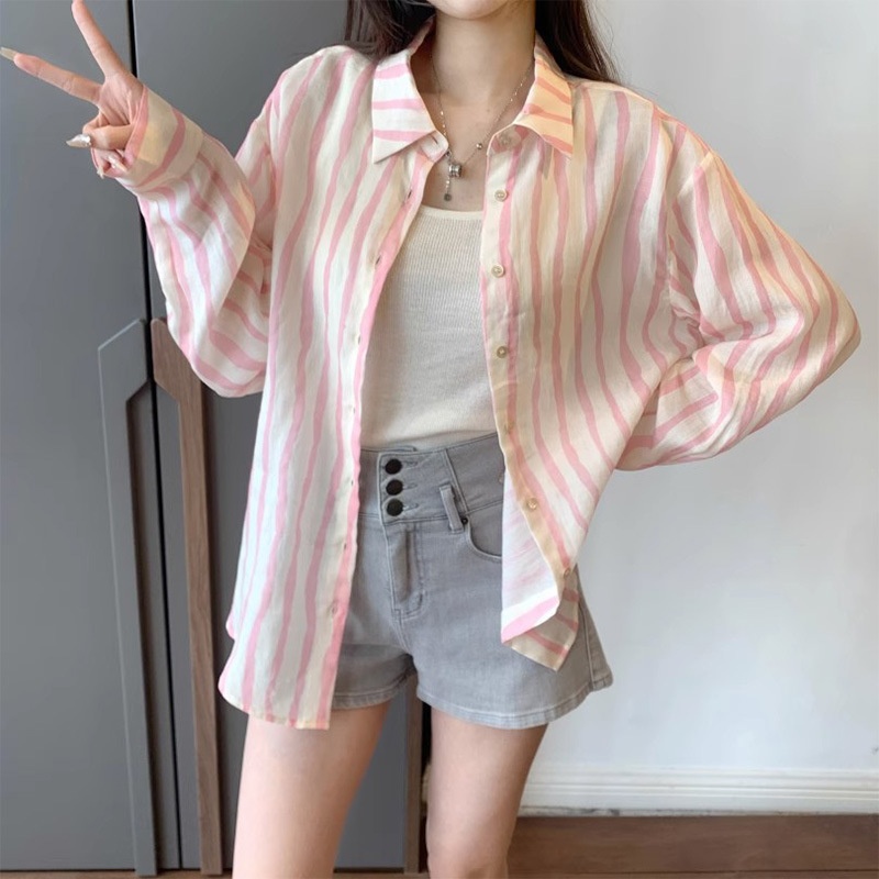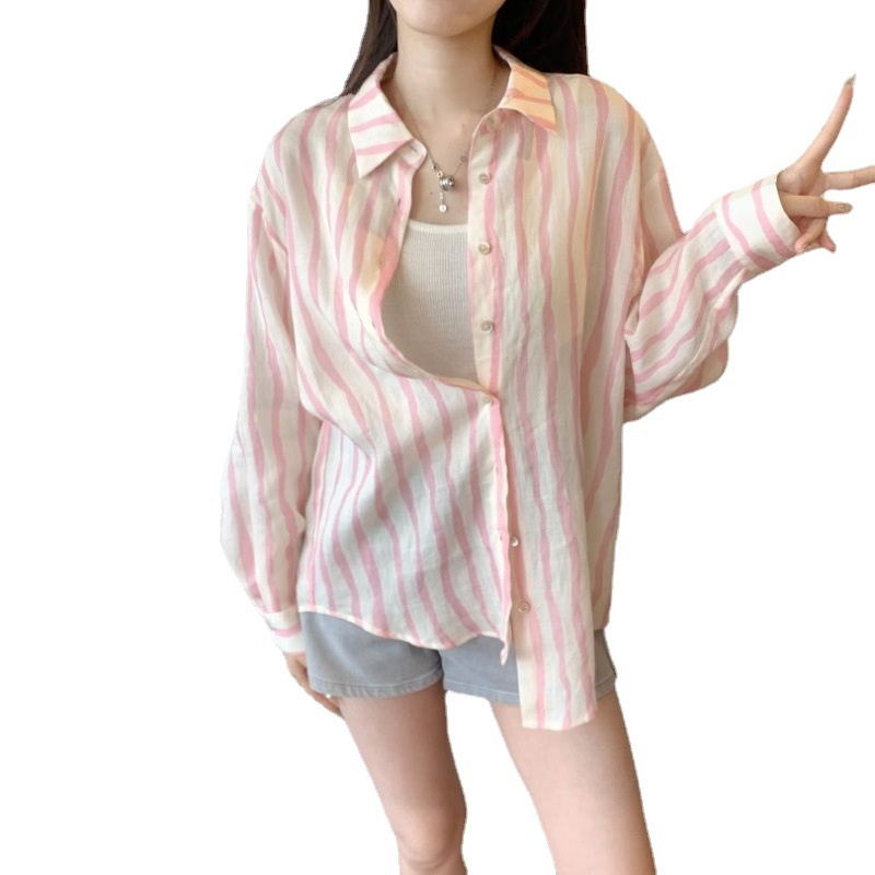 Lazy Style Long-sleeved Pink Striped Shirt Jacket Summer Sun Protection Sunshade Casual Korean Loose Tops For Women