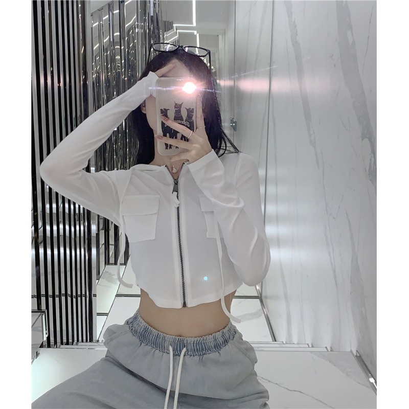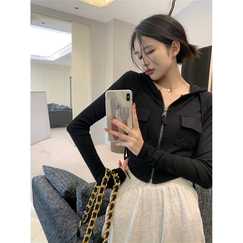 Autumn And Winter Hot Girl Hooded Pocket Slim Zipper Cardigan Jacket Sweatshirt Student Short Top Female