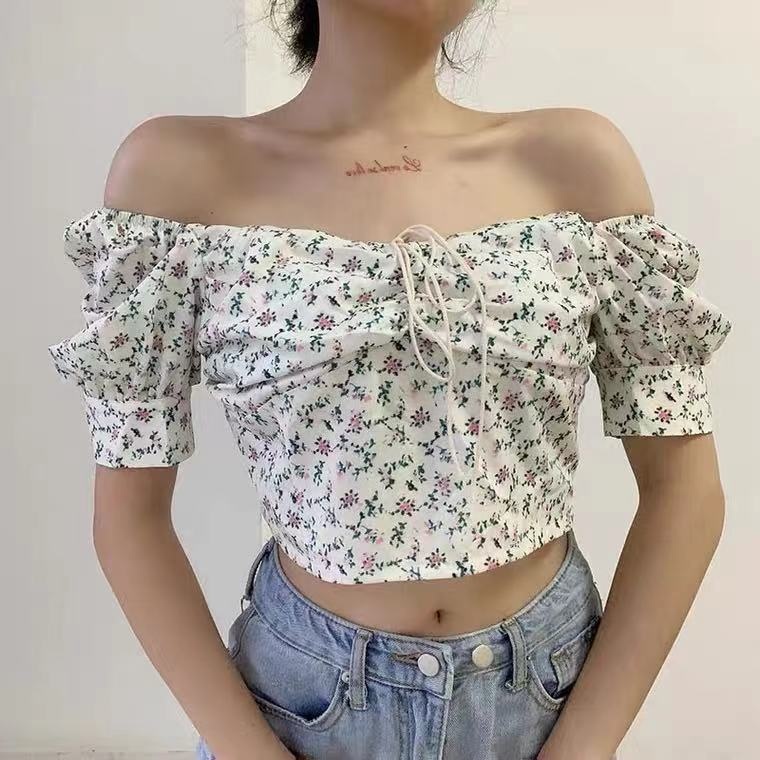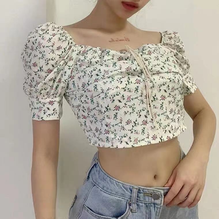 Spring And Summer Style Small Fresh Square Collar Floral Puff Sleeve Short Sleeve Top Slim Short T-shirt Small Shirt For Women