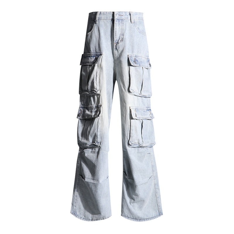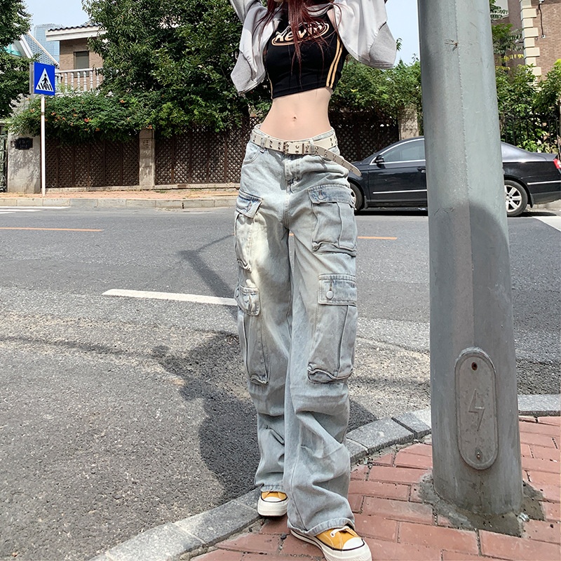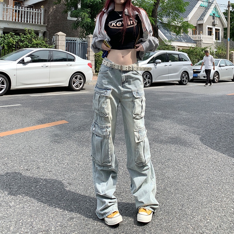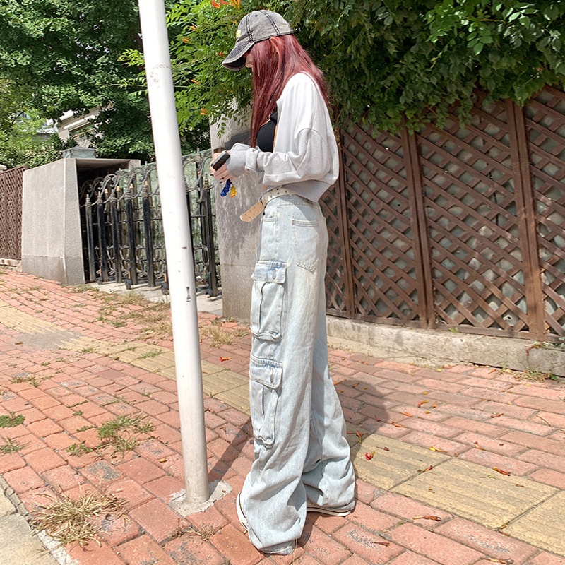 Designer Wide-leg Jeans For Women Spring Straight Loose High Waist Slim Multi-pocket Overalls