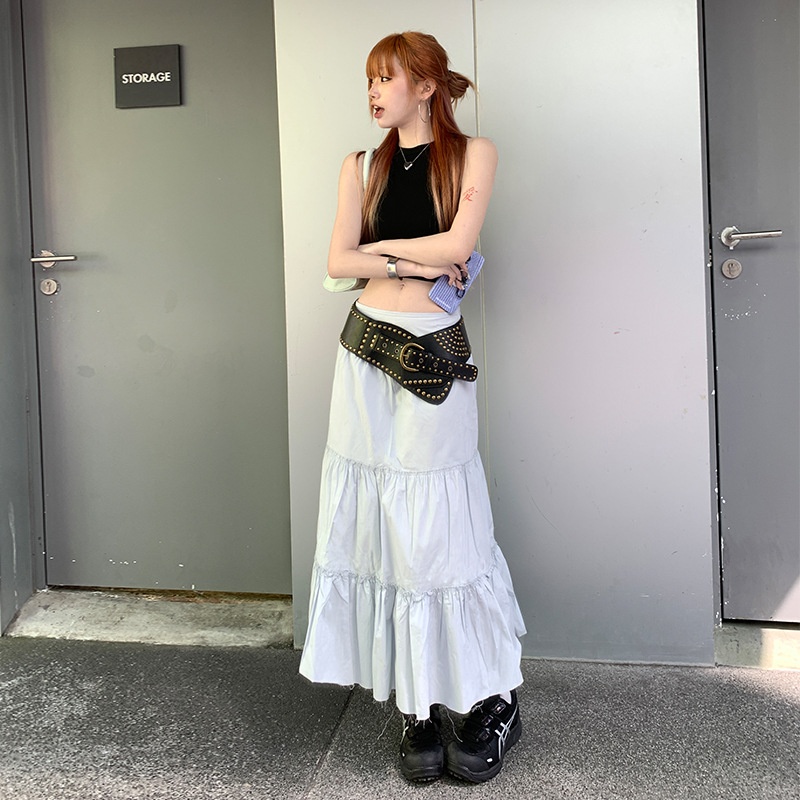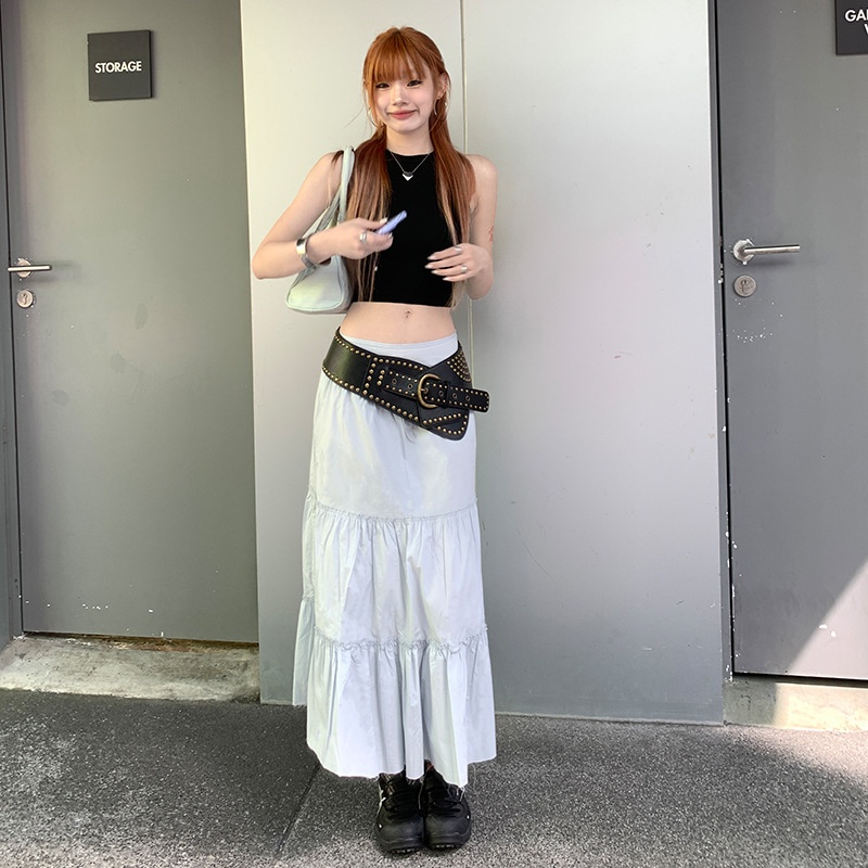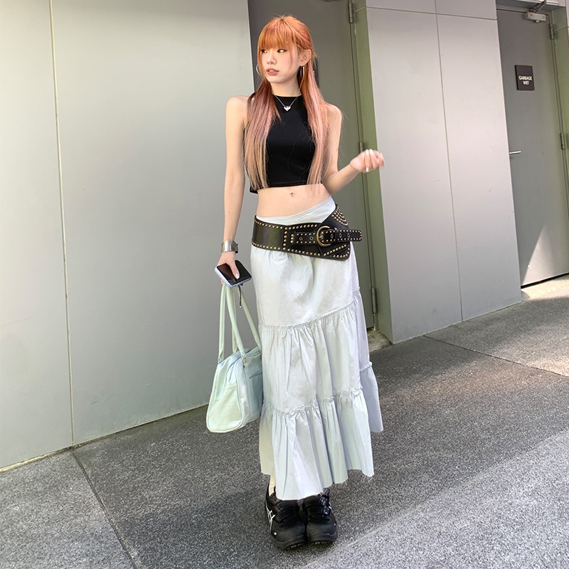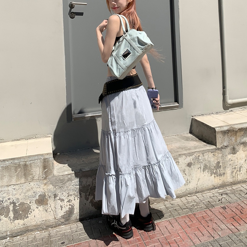 Ice Blue High Waist Pleated Skirt For Women Spring A-line Slim Medium And Long Casual Cake Skirt