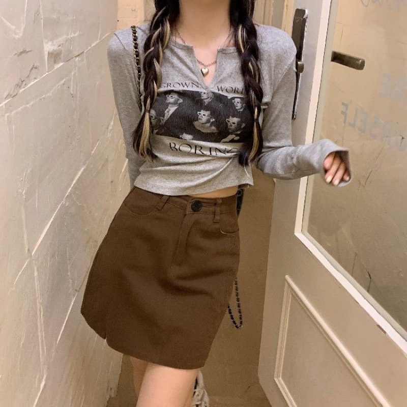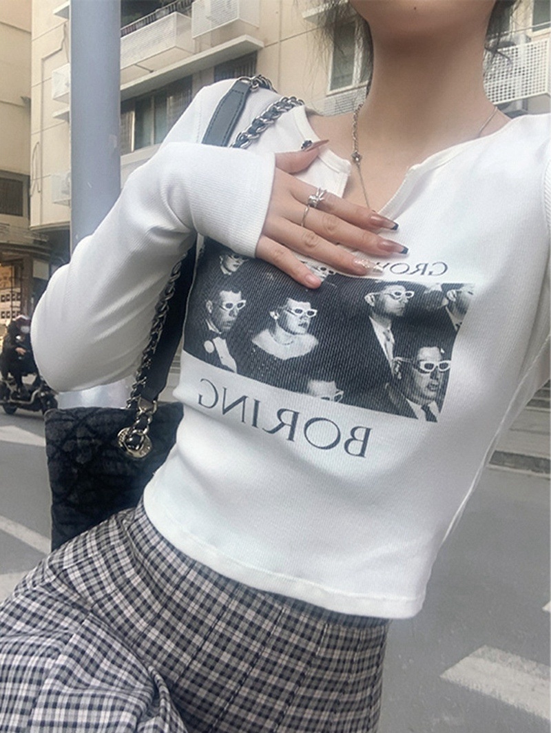 Autumn American Retro Hot Girl Short Print Contrast Color Long Sleeve Round Neck T-shirt Female Design Niche Top