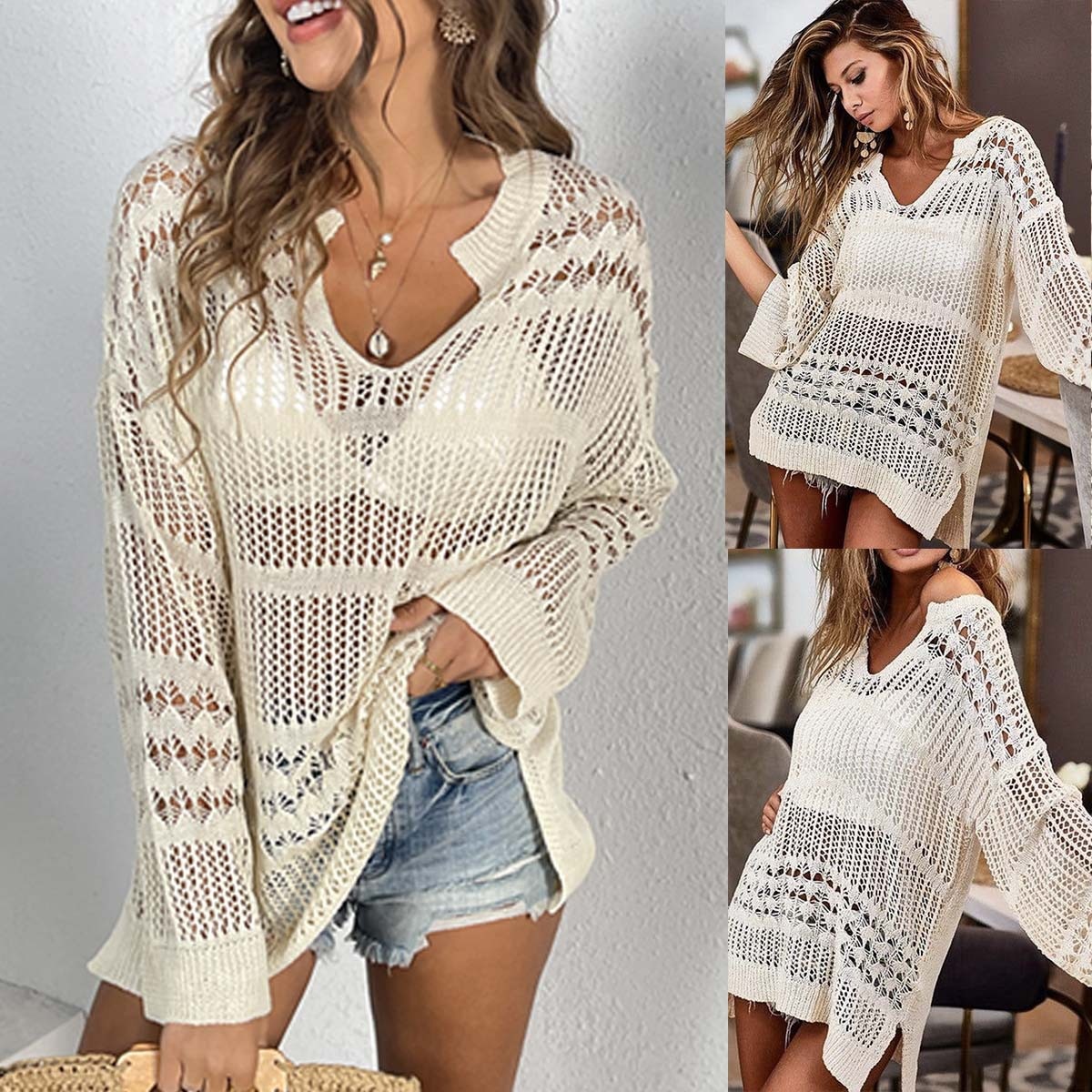 Hollow Blouse Blouse Long Sleeve Beach Blouse UCollar Swimsuit Outside
