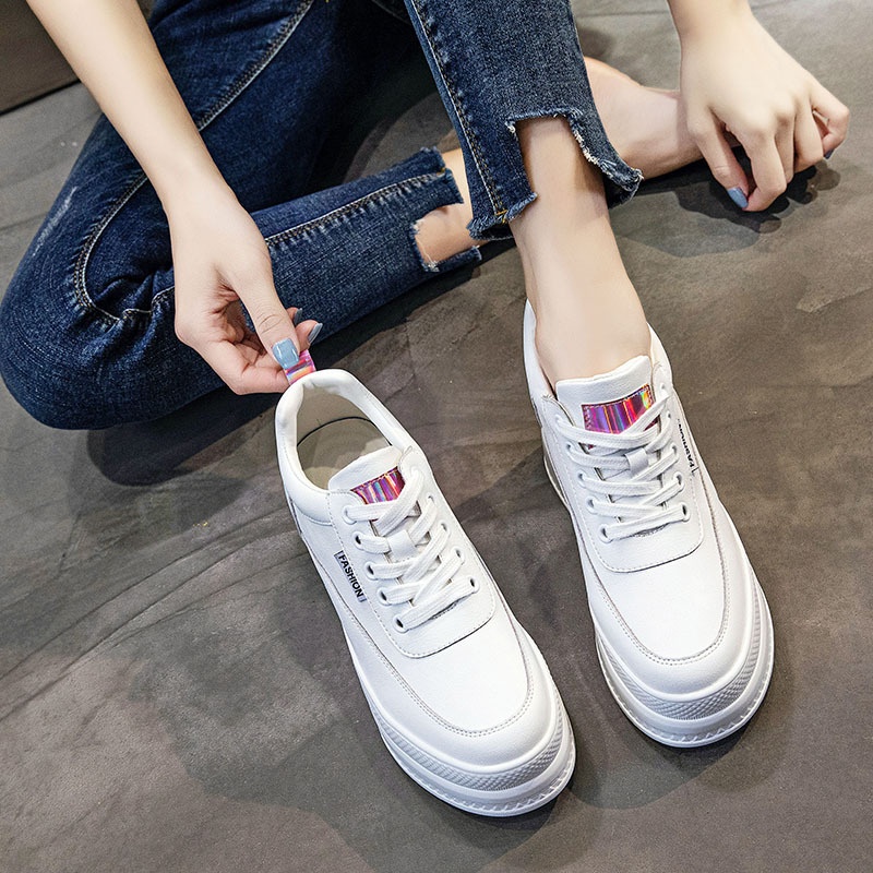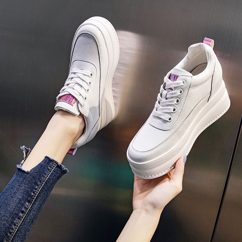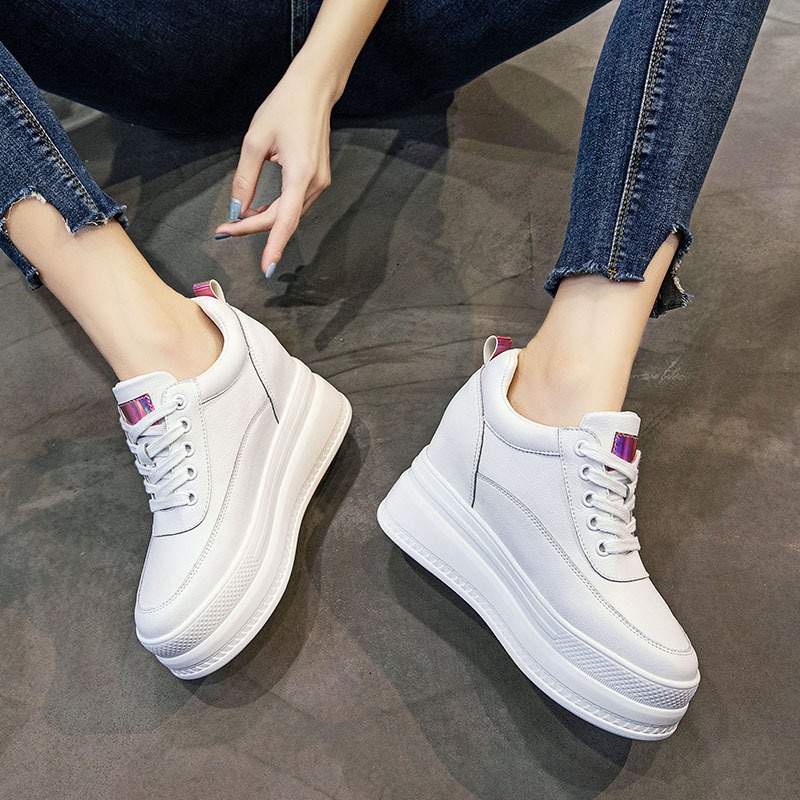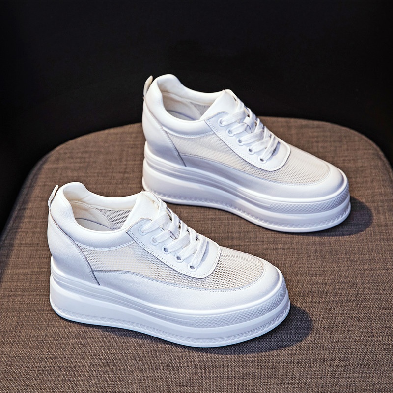 Genuine Leather White Shoes Summer Thin Women's Shoes With8cm Inner Height Increase Mesh Thick Bottom Breathable Hollow Casual Sneakers Mesh Shoes