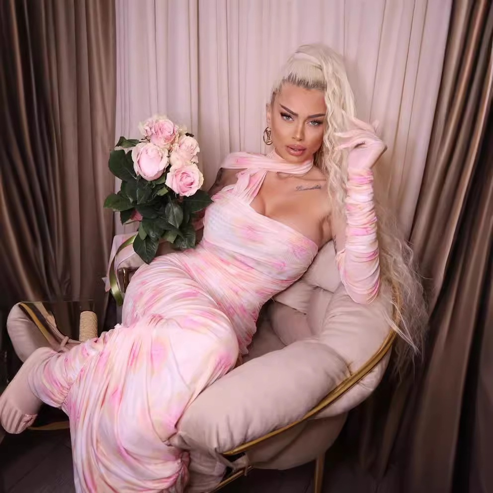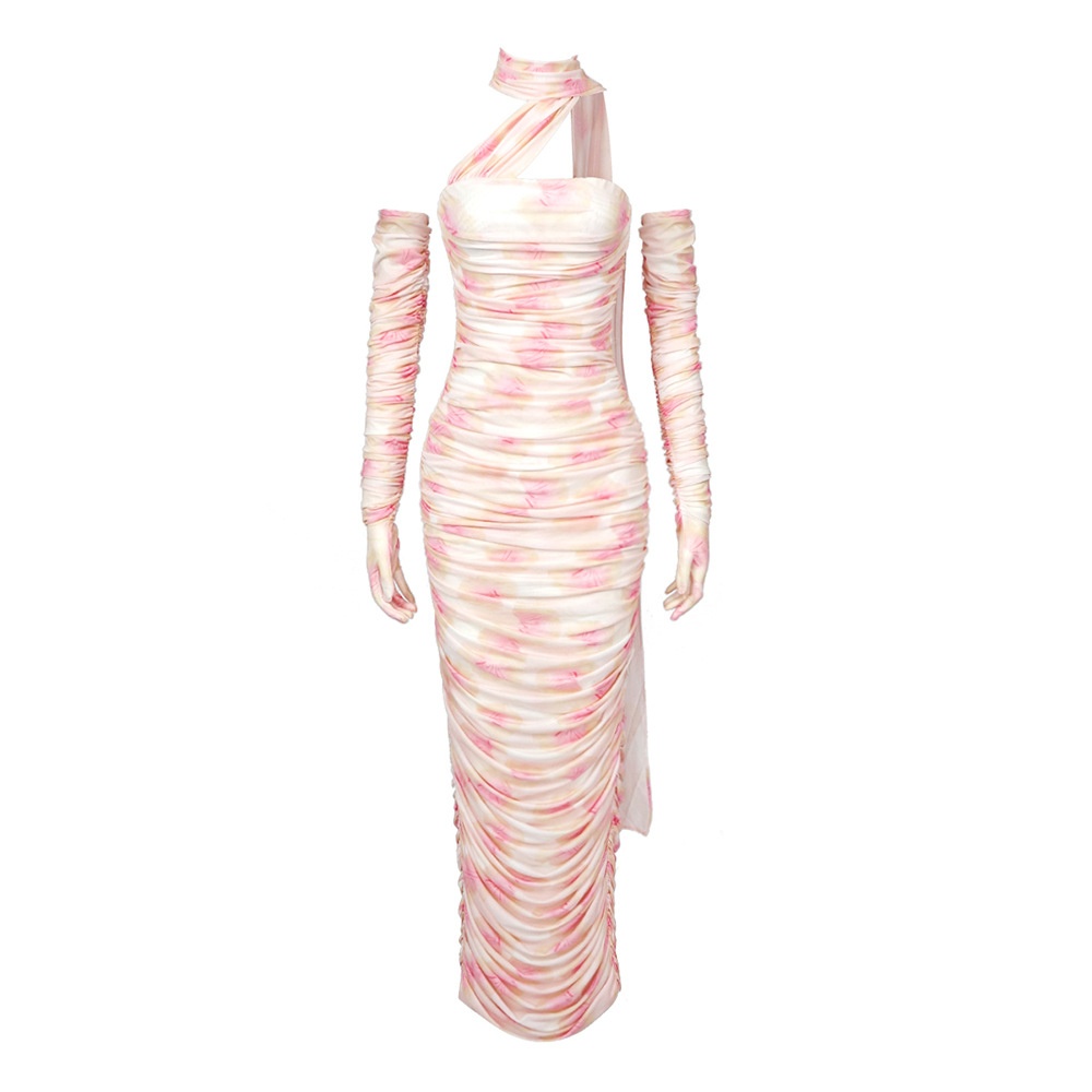 Summer Gloves Off-shoulder Printed Mesh Ribbon Long European And American Women's Elastic Slim Dress French Skirt Female