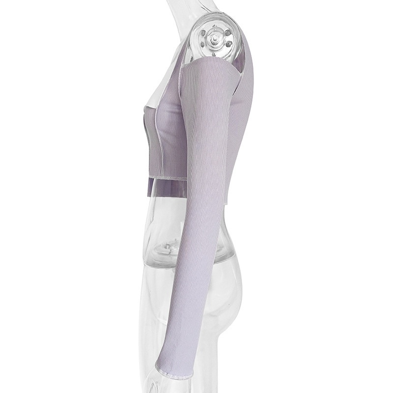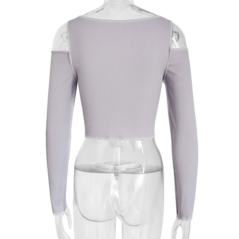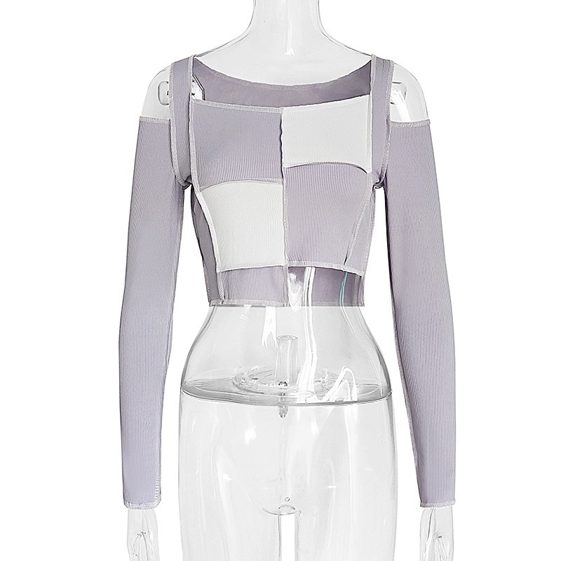 European And American Autumn Women's Clothing Reverse Edge Contrast Color Stitching Long Sleeve Navel-baring T-shirt Tops Foreign Trade