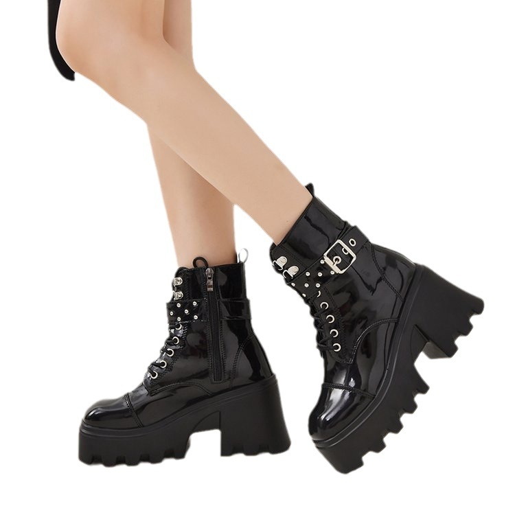Euro-american Platform Mid-calf Boots Women's Platform Martens Ankle Boots Motorcycle Chain Rider Boots With Thick Heels