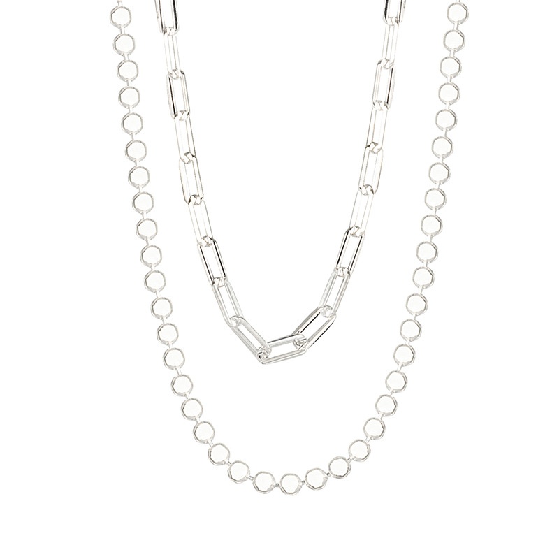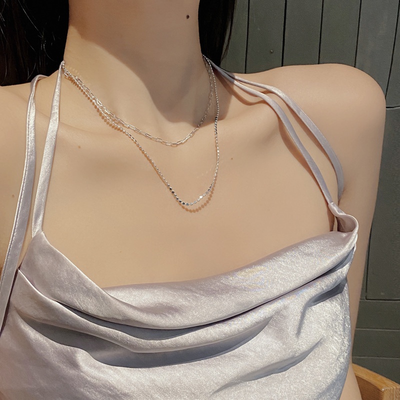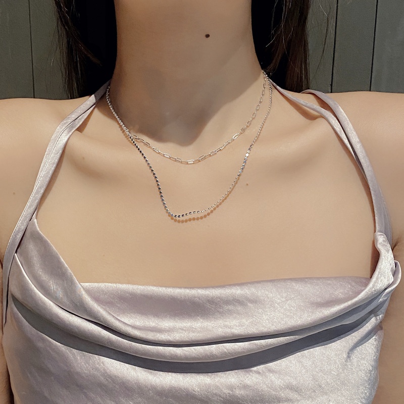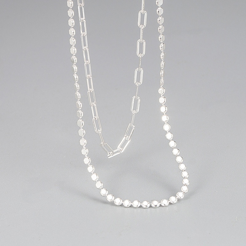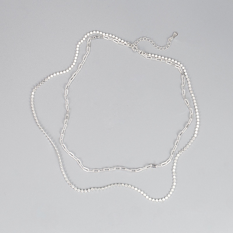 South Korea Dongdaemun S925 Sterling Silver Double-layer Flat Square Bead Necklace Long Cross Simple Strong Chain Clavicle Chain Female Jewelry
