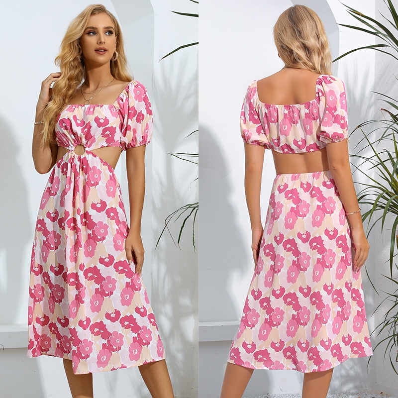 Square Neckline Shoulder Printed Waist Sexy Slim Short-sleeved Dress