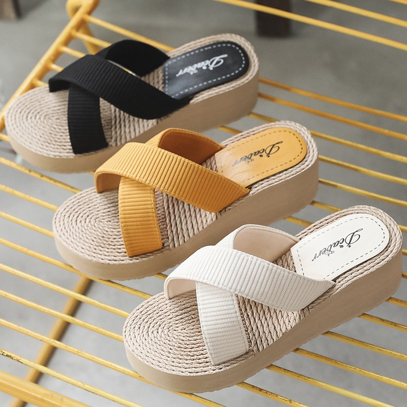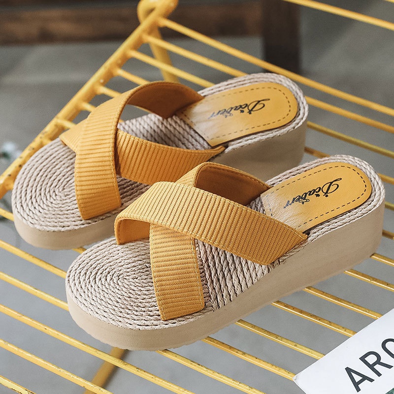 Summer Imitation Straw Travel Women's High-heeled Sandals For Outer Wear Espadrille Flip-flops Beach Fashiony Wedge-heeled Slippers