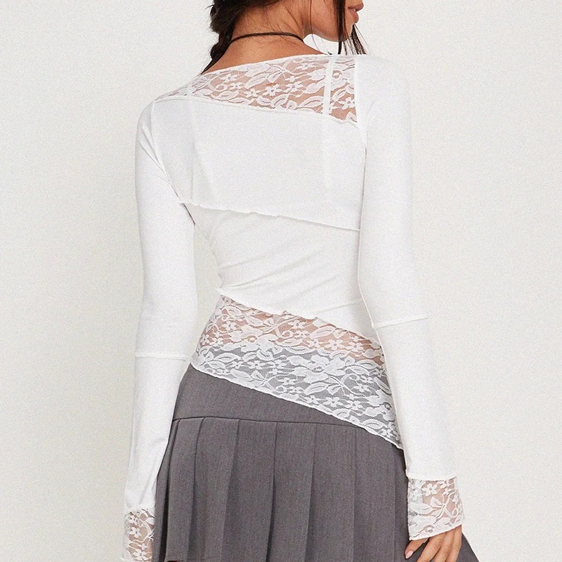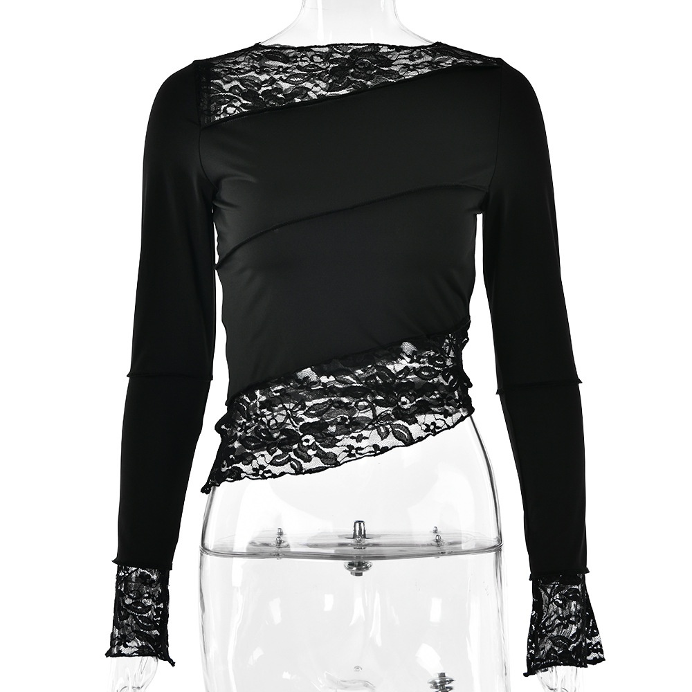 Spring Patchwork Tops For Women European And American Fashion Sexy Slim Fit Hook Flower Long Sleeve Round Neck T-shirt