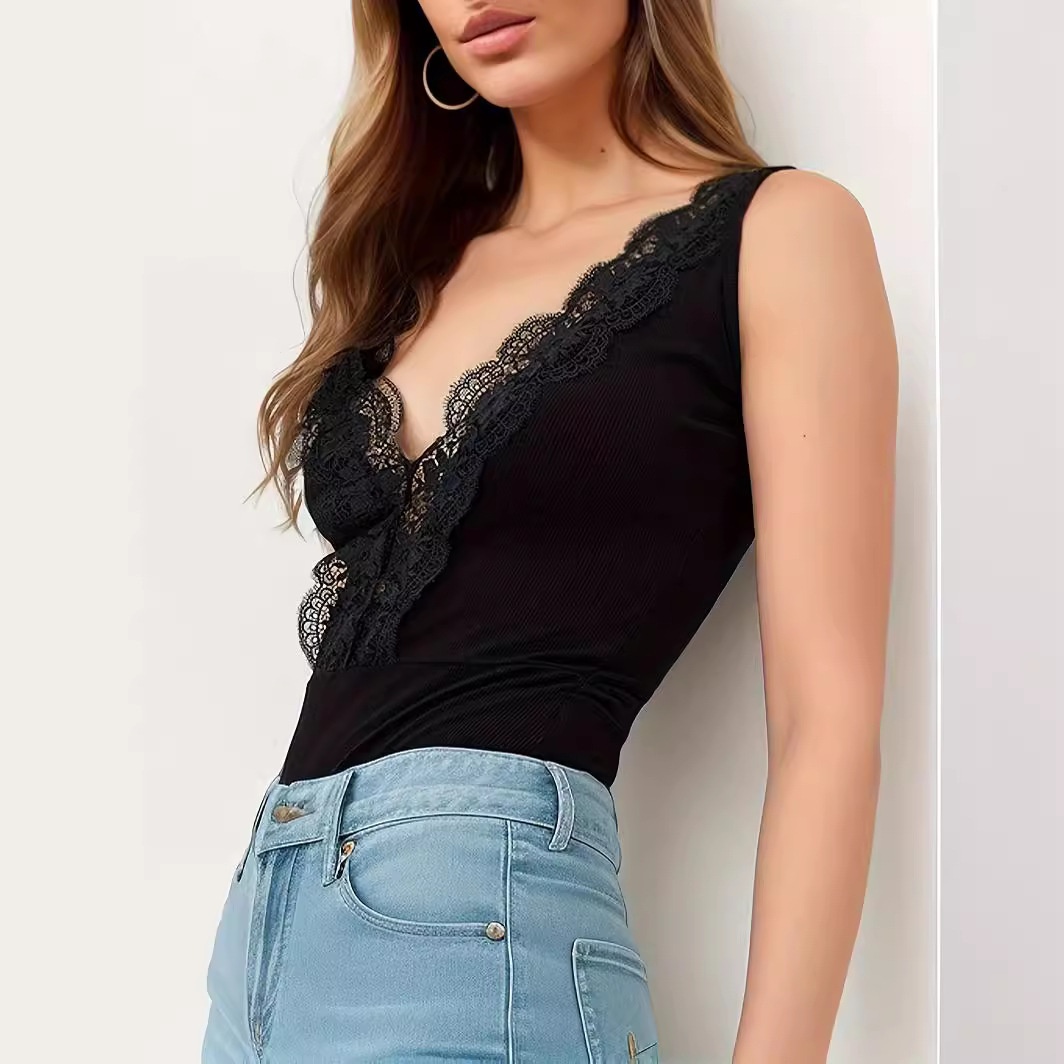 Summer European And American Women's Clothing Sexy Slim V-neck Lace Ribbed Suspender Jumpsuit