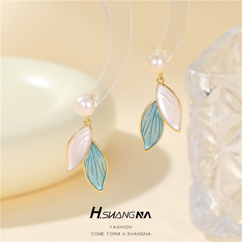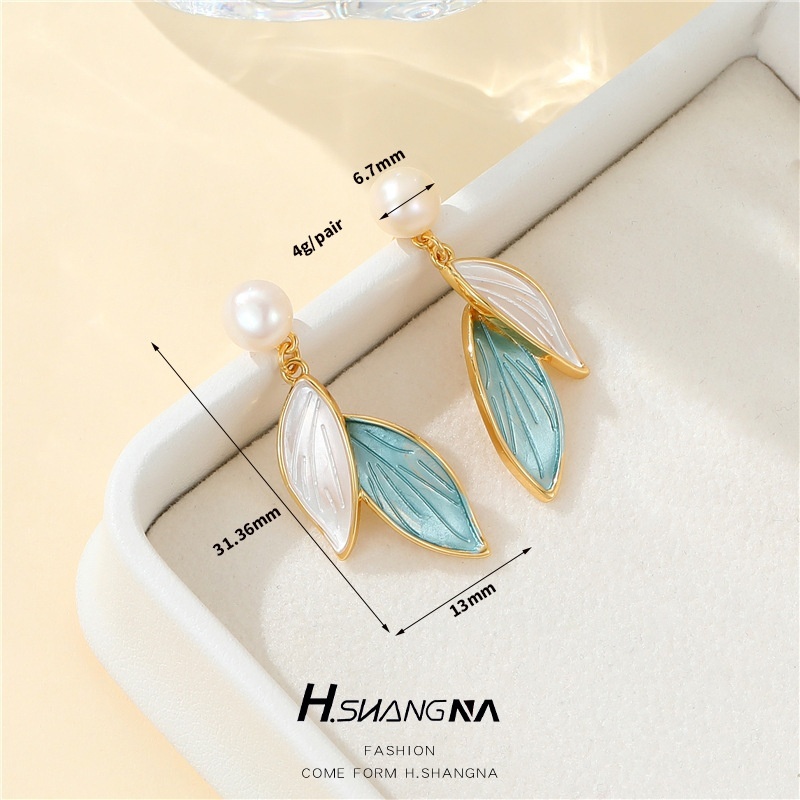 High-end Light Luxury Pearl Vintage Earrings Niche Design Blue Leaves Gentle Temperament Popular Leaf Earrings For Women