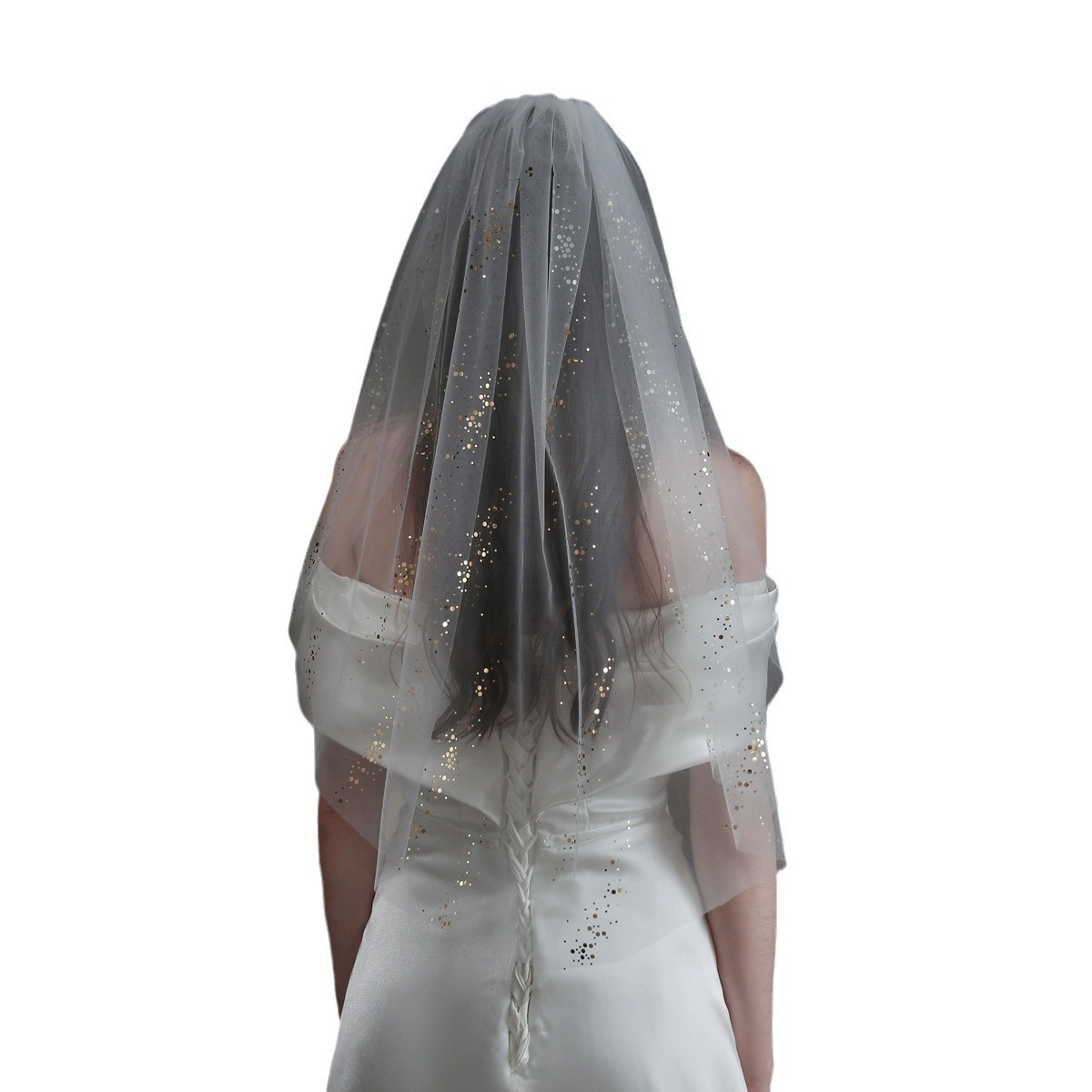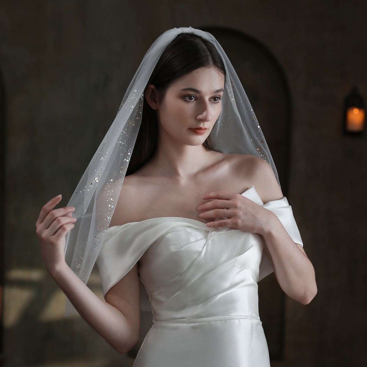 V854 European And American Gold Glitter Bridal Veil White Single Layer Super Fairy License Photo Wedding Headdress