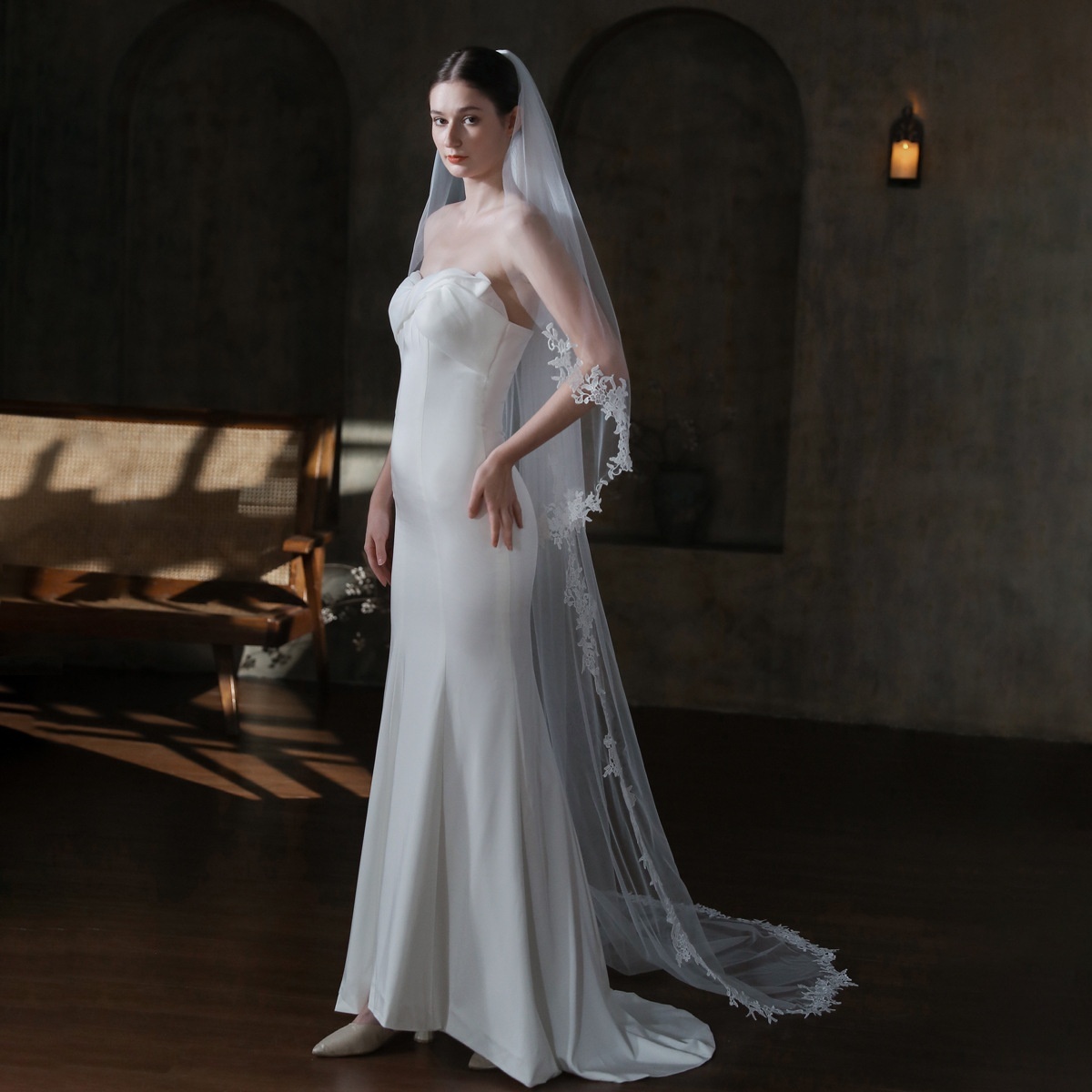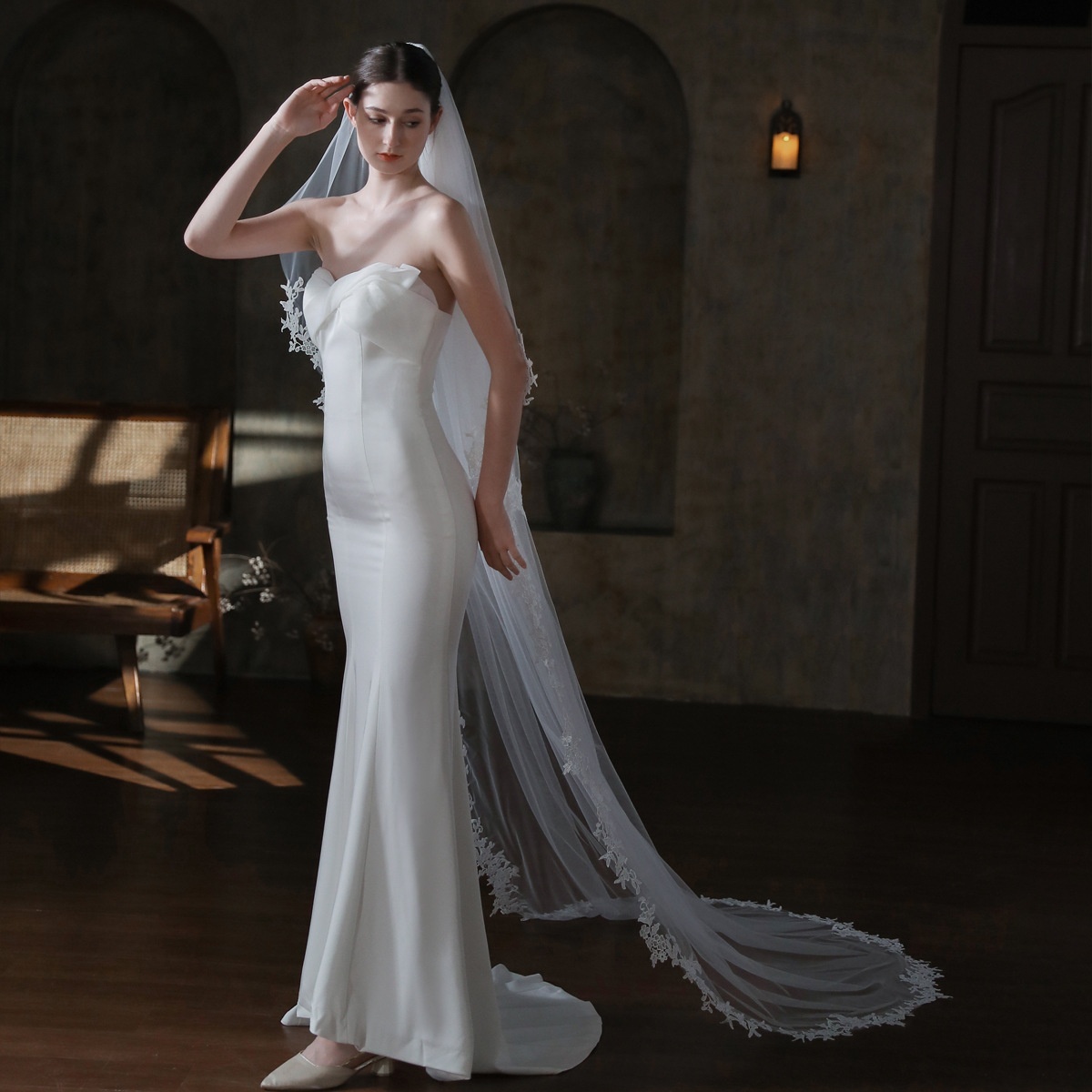 V868 Trailing Bridal Veil Long Double Lace Lace Face-covering Church Wedding Travel Soft Yarn Headdress
