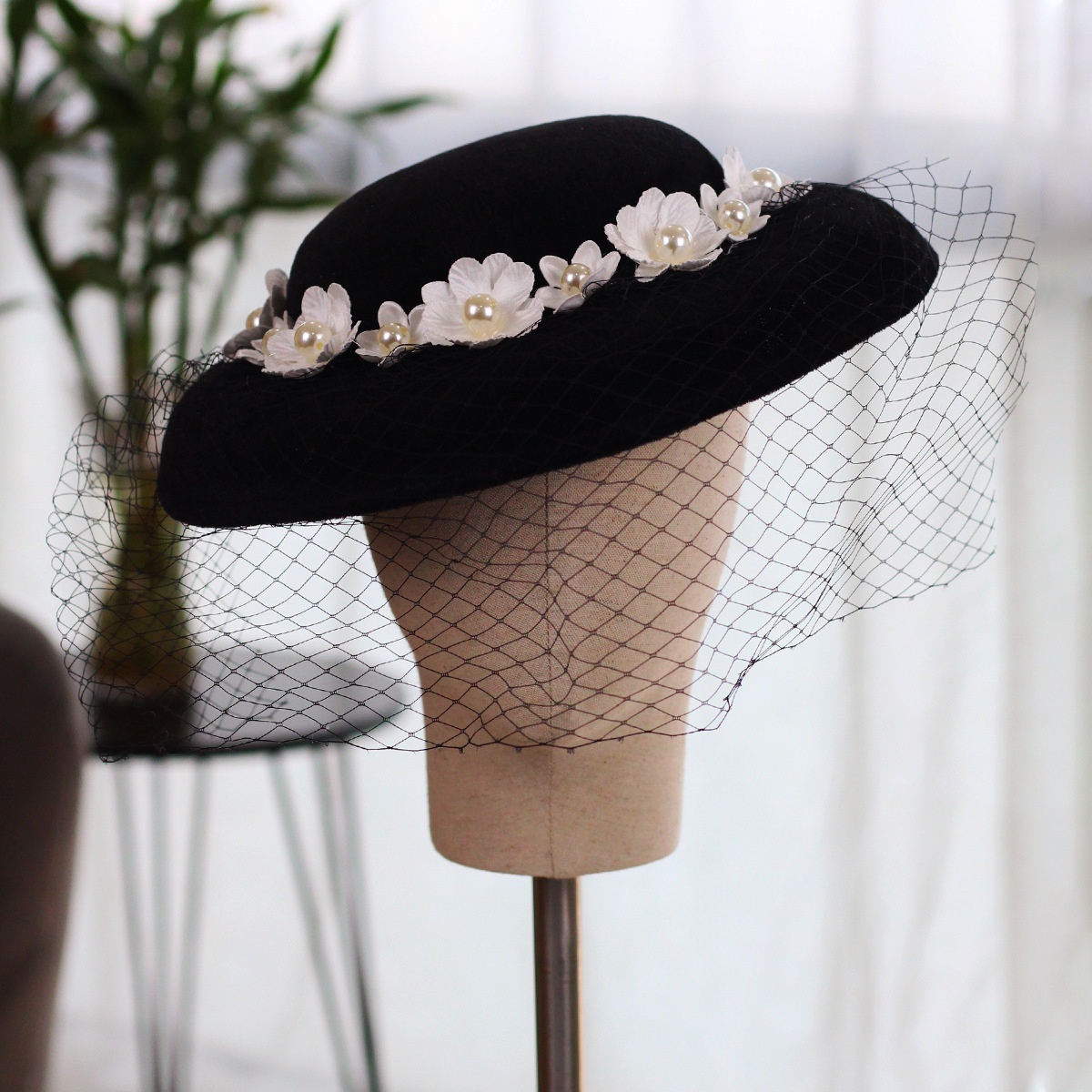 M005 French Hepburn Black Hat All-match Elegant Mesh Face-covering Wedding Photo Fashion British Style Hat