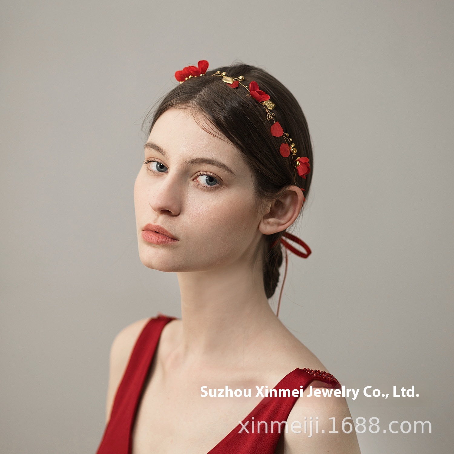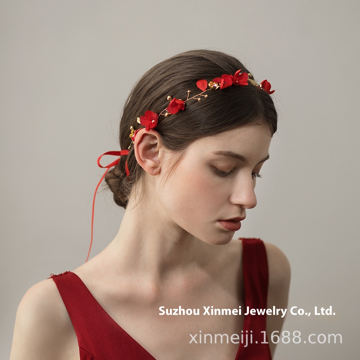 O621 Chinese Style Red Flower Bridal Headdress National Style Xiuhe Dress Red Hairband Wreath Accessories