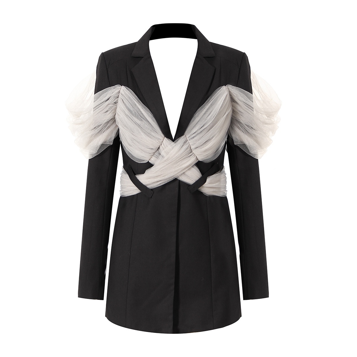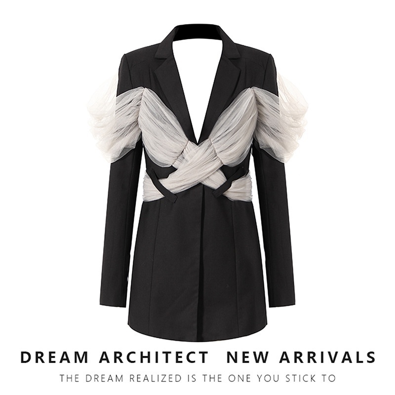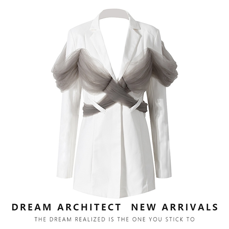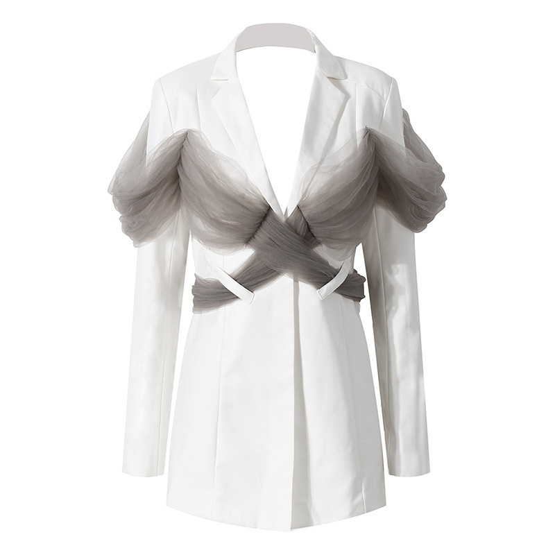 French Style Niche White Suit Jacket For Women Contrast Color Slim Fit Polka Dot Mesh Splicing Backless Suit