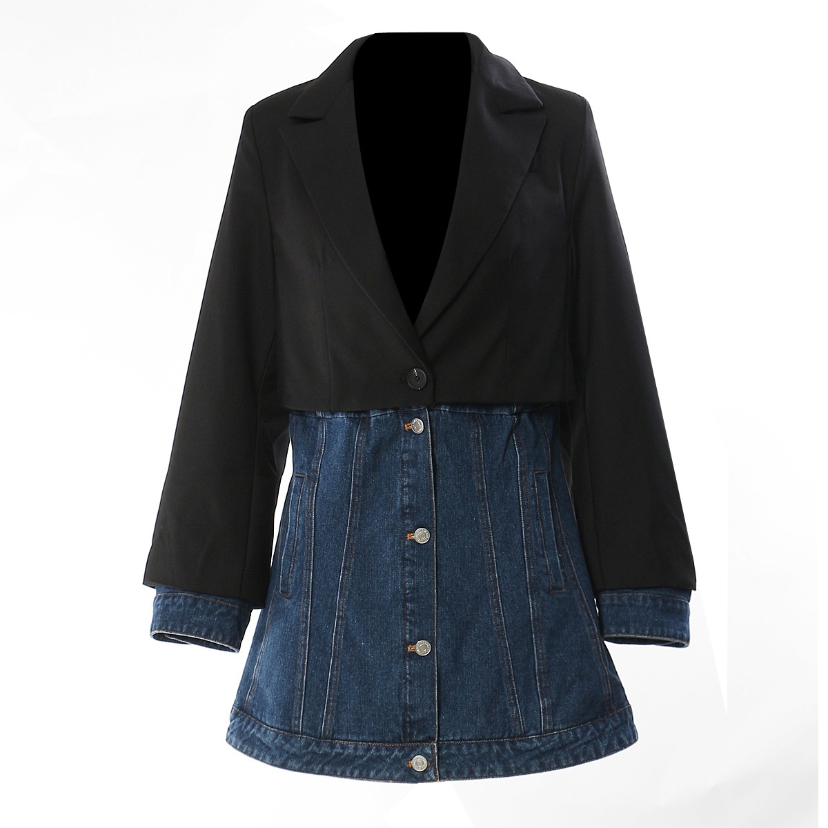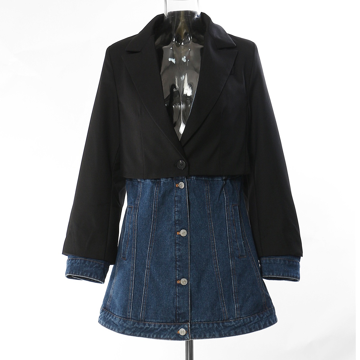 Fake Two-piece Slim-fit Denim Patchwork Suit Mid-length Denim Top Jacket1660