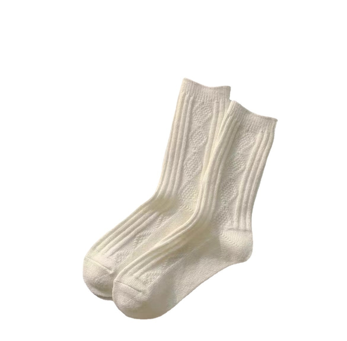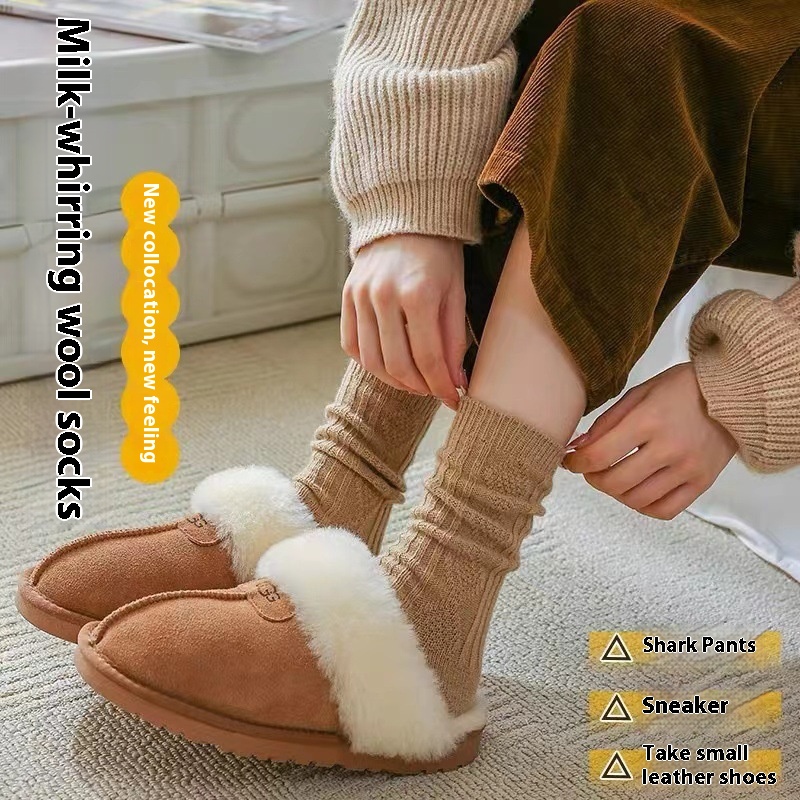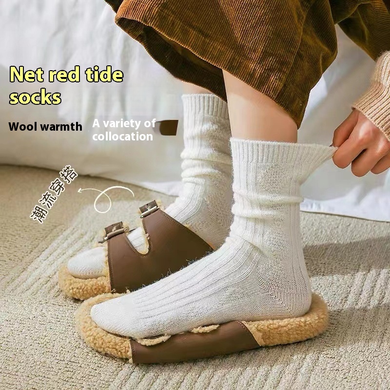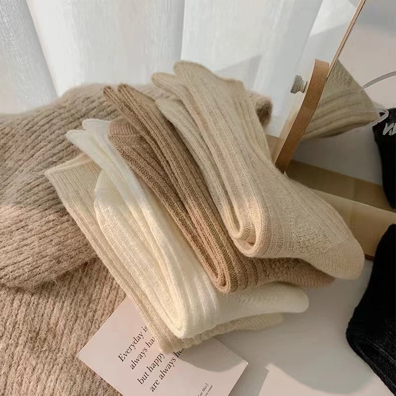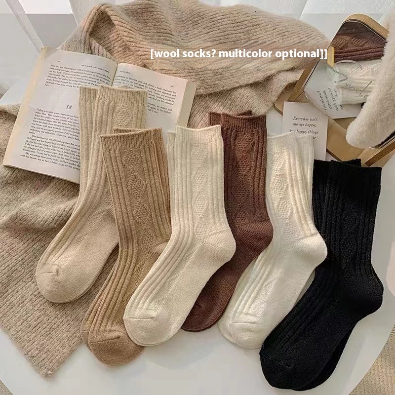 Wool Socks For Men And Women Solid Color Mid-tube Socks Autumn And Winter Thick Warm Straight Striped Pattern College Style Piled Long Socks