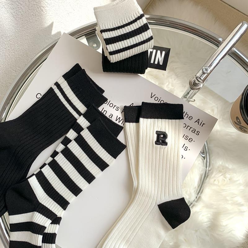 Zhuji Socks Women Embroidery Japanese Double Needle RLetter Pile Socks Women's Medium Tube Bamboo Cotton Socks Tide MK