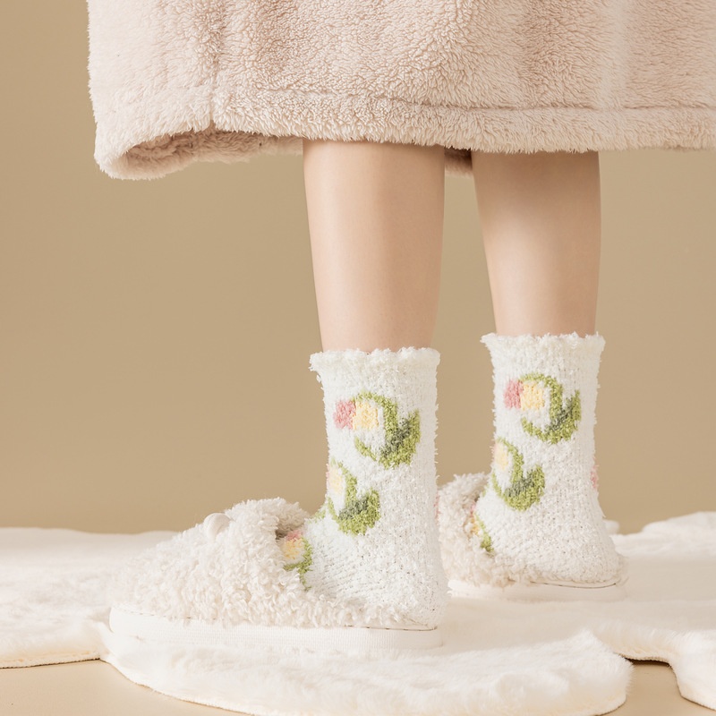 Coral Fleece Socks For Women Winter Thickened Non-shedding Home Sleeping Socks Tulip Warm Mid-tube Floor Socks