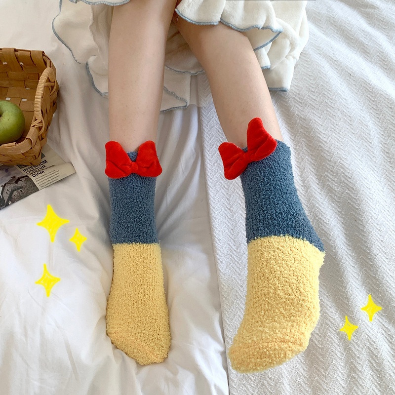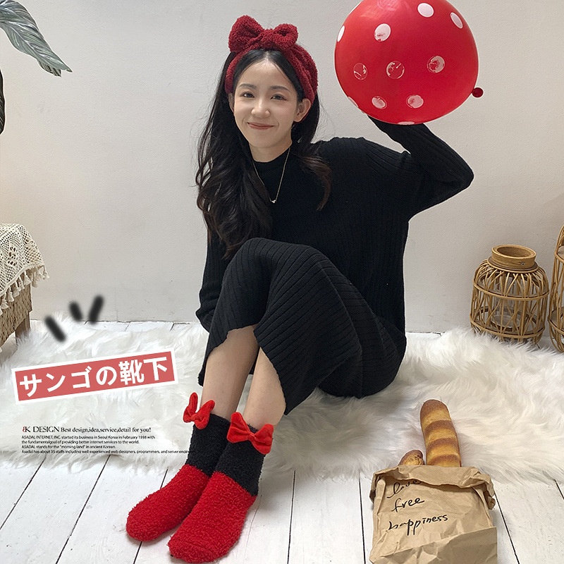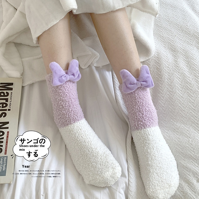 Coral Velvet Socks For Women Wedding Photo Bowknot Women Autumn Socks Winter Plus Velvet Thickened Confinement Sleep Socks Zhujis