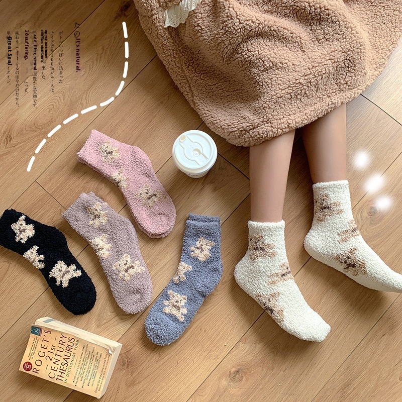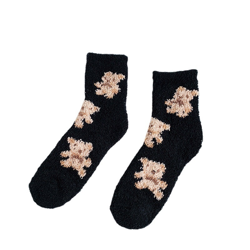 Coral Velvet Socks For Women Cute Little Beary Mid-tube Women's Socks Winter Thickened Velvet Home Confinement Sleeping Socks