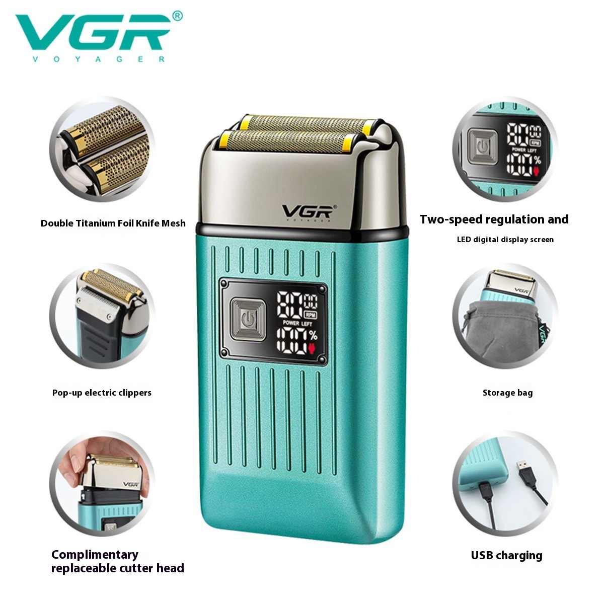 V G R Shaving Set Sideburns Repair Knife Bald Hair Clipper I P X6 Washable Digital Display Reciprocating Razor357