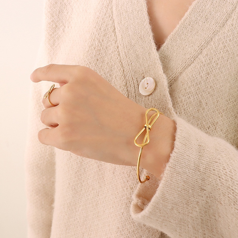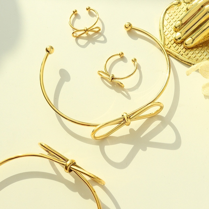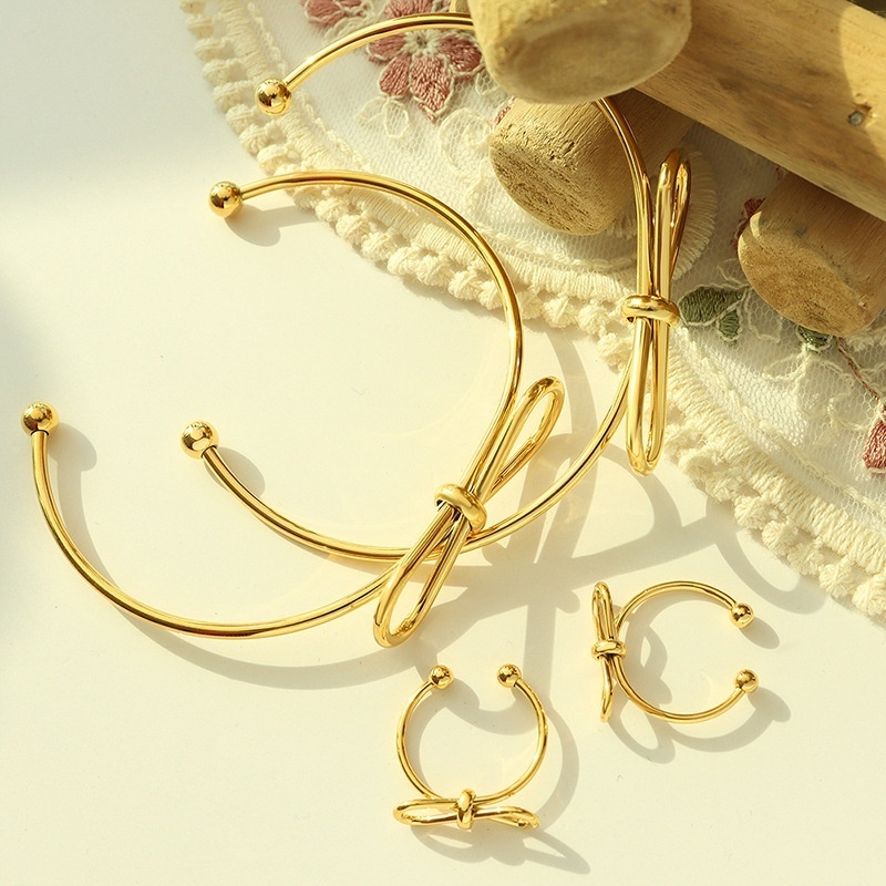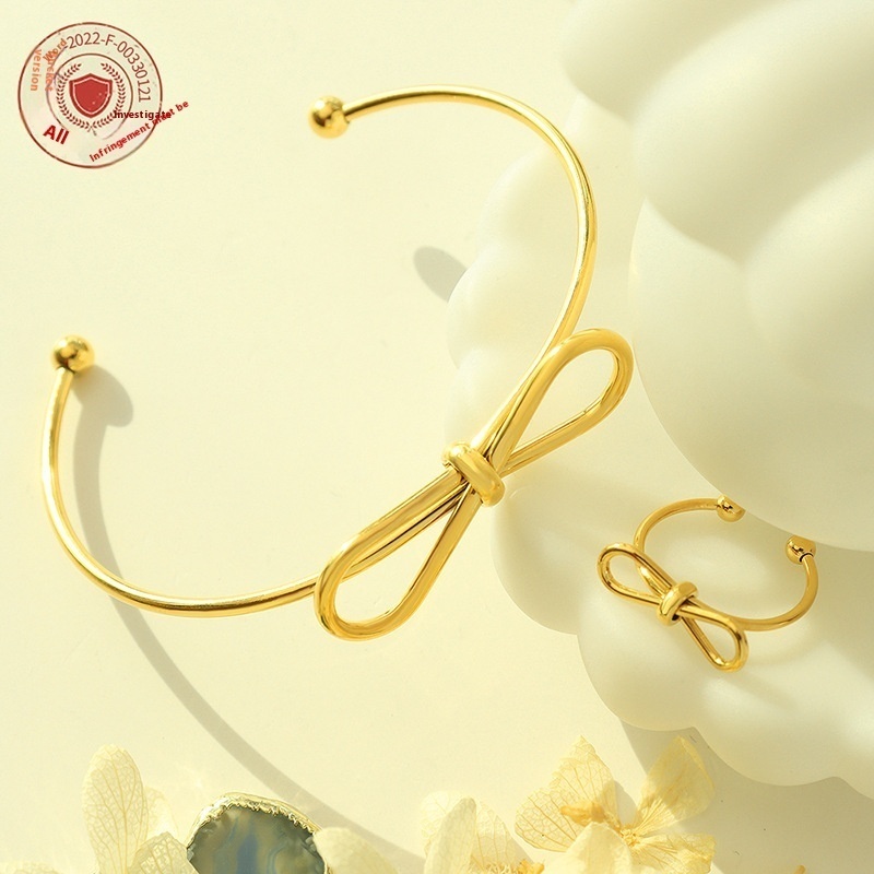 Geometric Bow Open Bracelet Ring Two-piece Set Japanese And Korean Small Fresh Naked Chain Versatile No Fading One Piece Dropshipping