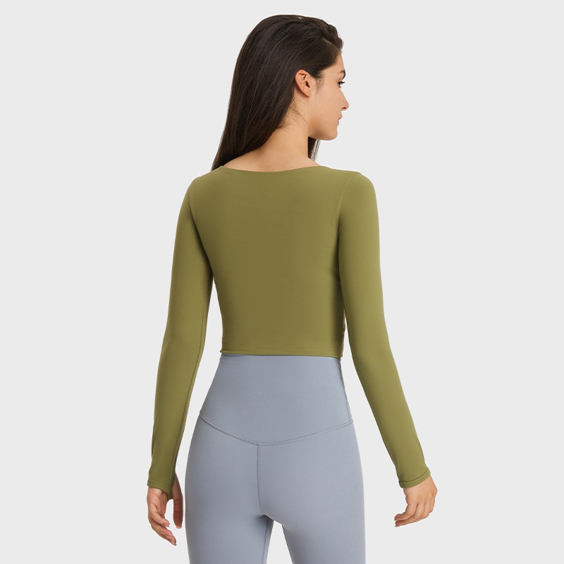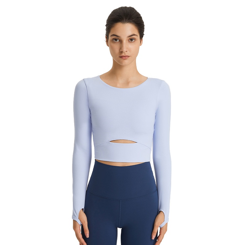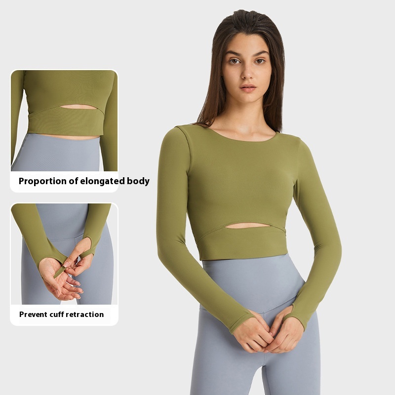 A Model Of Drop-shipping Yoga Long-sleeved Tops With Chest Pads For Women With Waist Exposed Short Sexy Running Sports Fitness Clothes