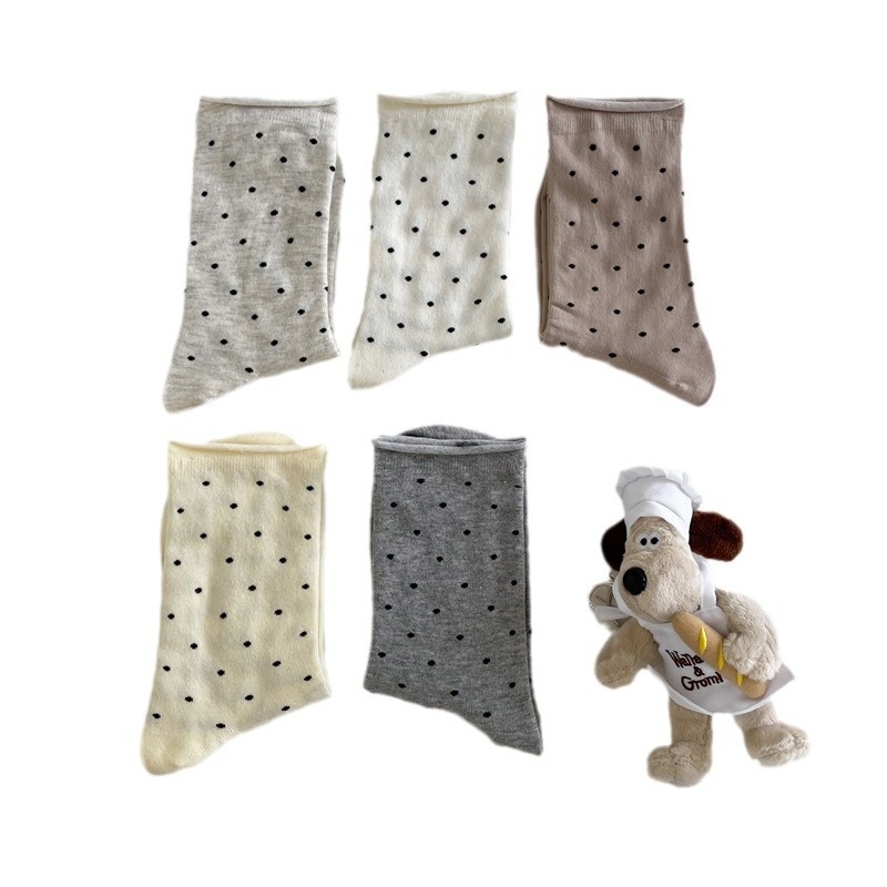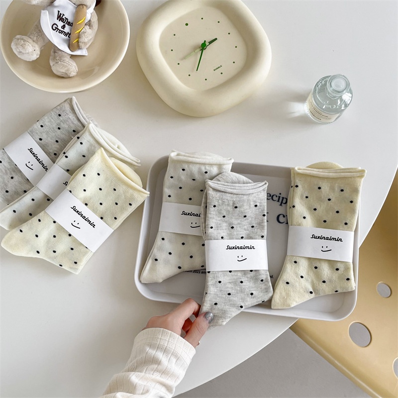 Korean Style Curled Hem Pile Socks For Women Small Dots Spring And Summer Sweat-absorbent Cream Curled Hem Dot Mid-tube Socks Confinement Socks