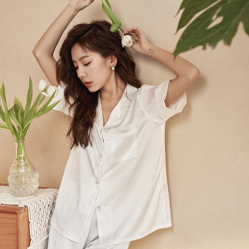 Summer Ultra-thin Lace Splicing Short-sleeved Shorts Pajamas Women's Satin Chiffon One-piece Ladies Home Clothes Suit