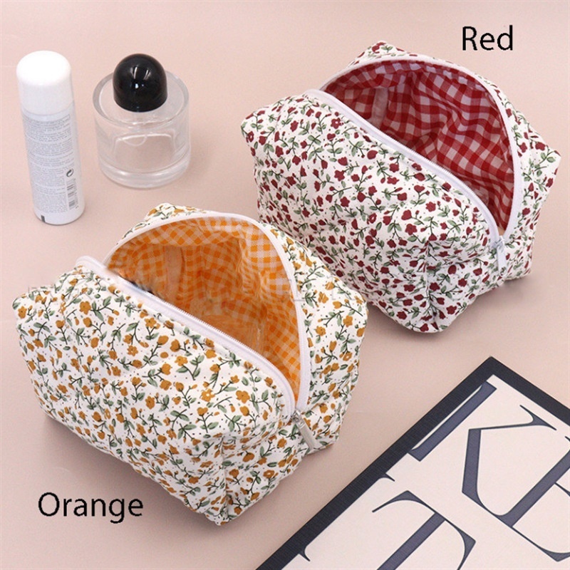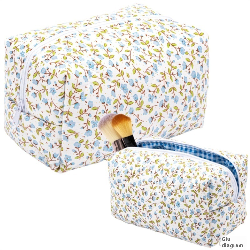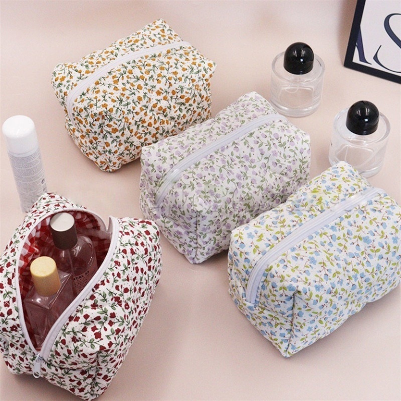 French Flower Quilted Cosmetic Bag Cotton Fluffy Large Capacity Travel Toiletry Bag Cute Floral Skin Care Bag