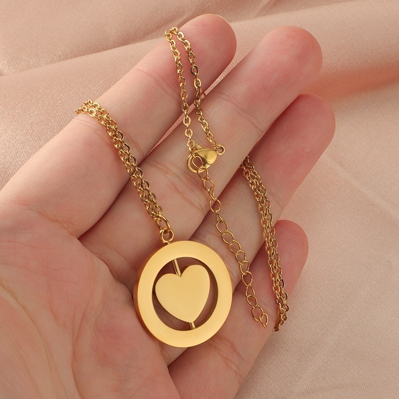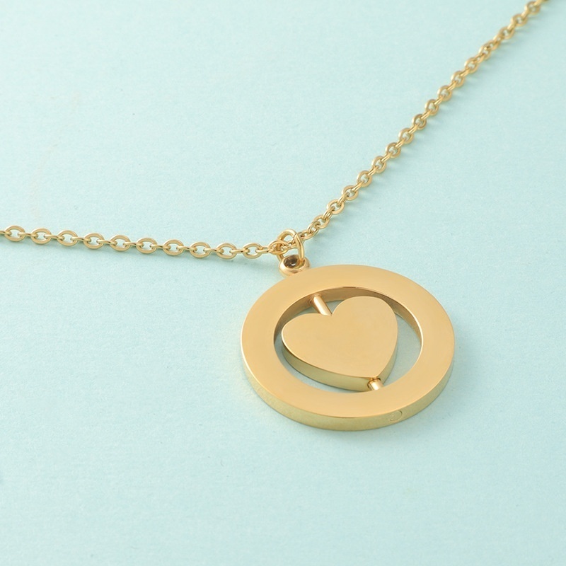 Creative European And American Style Stainless Steel Love Heart Rotatable Double-layer Geometric Round Pendant Necklace Jewelry Clavicle Chain