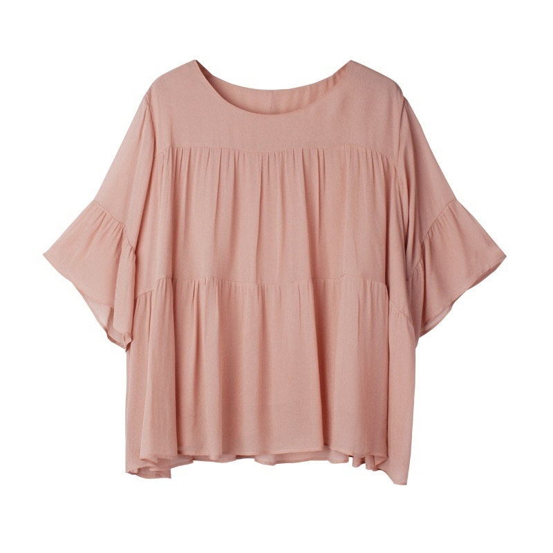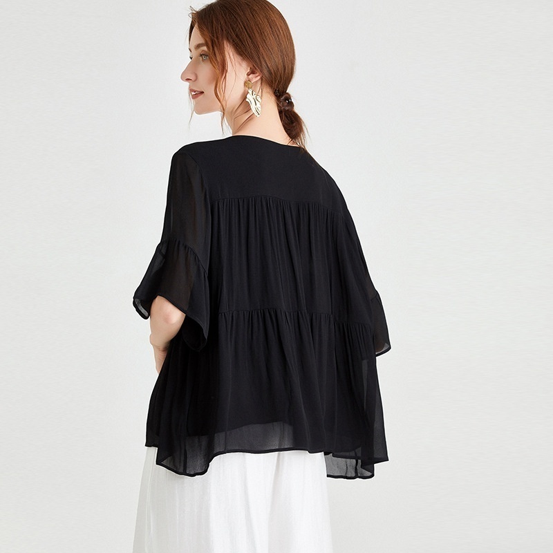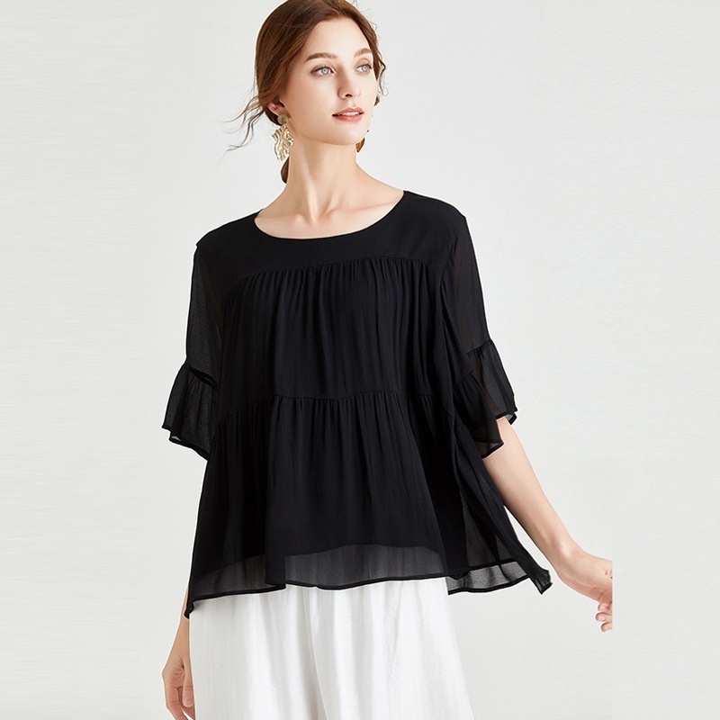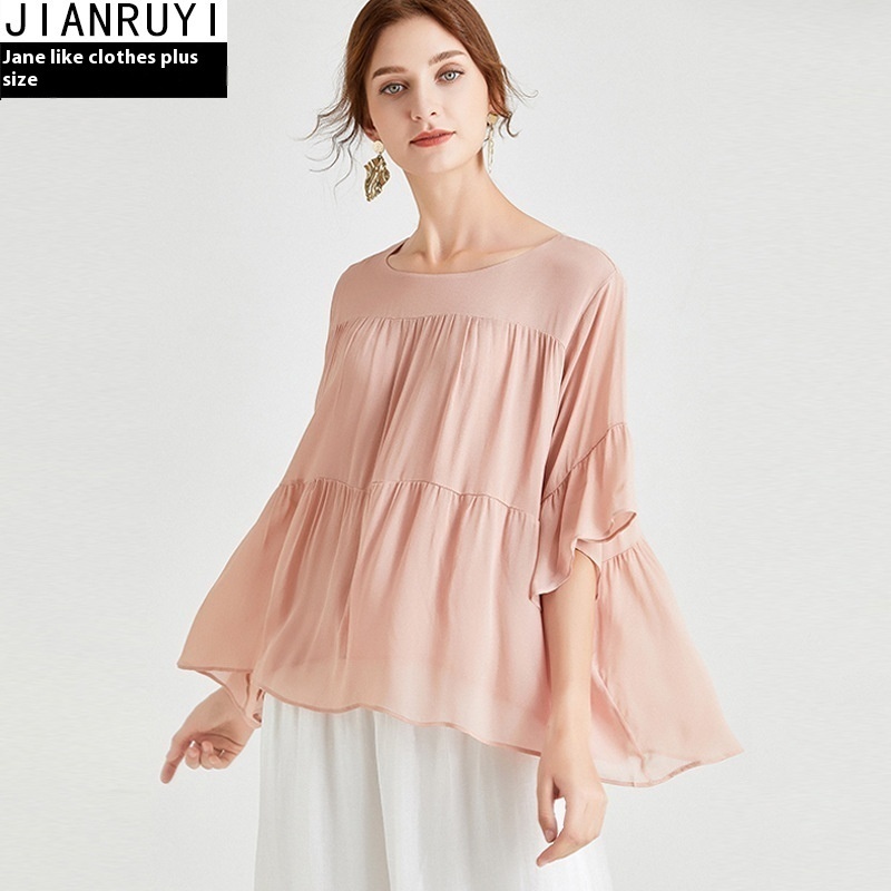 Fat Girl Large Size Heavy Silk Blouse Female Summer Round Neck Loose Slim Mulberry Silk Short-sleeved Top Female