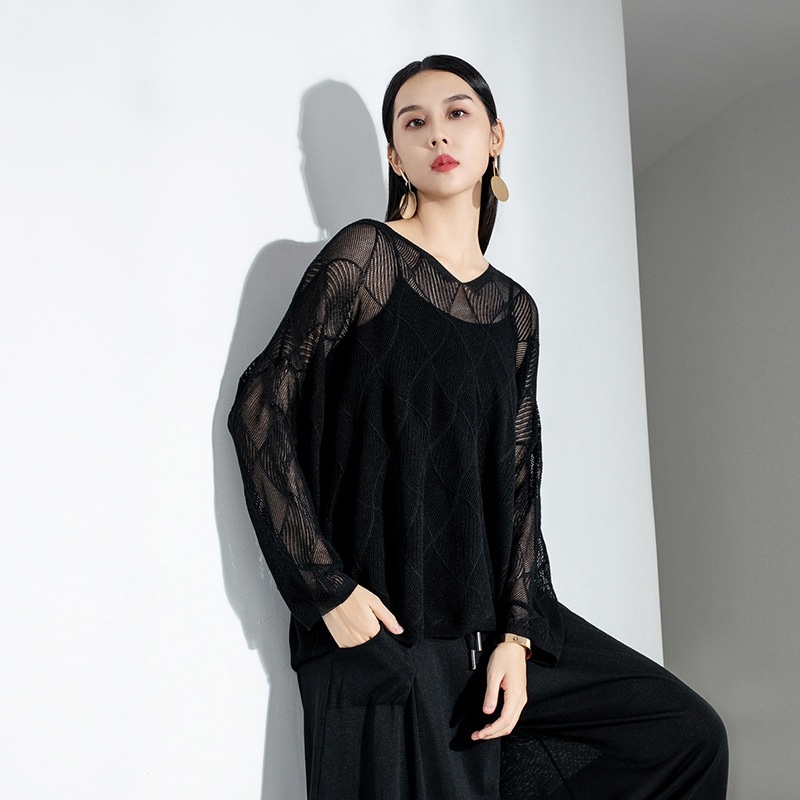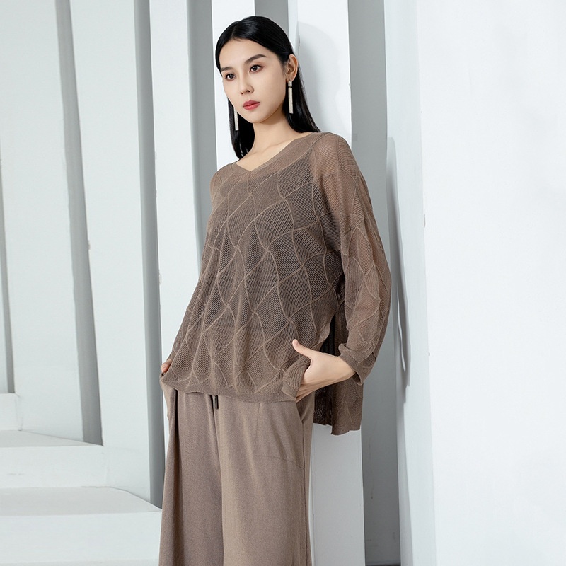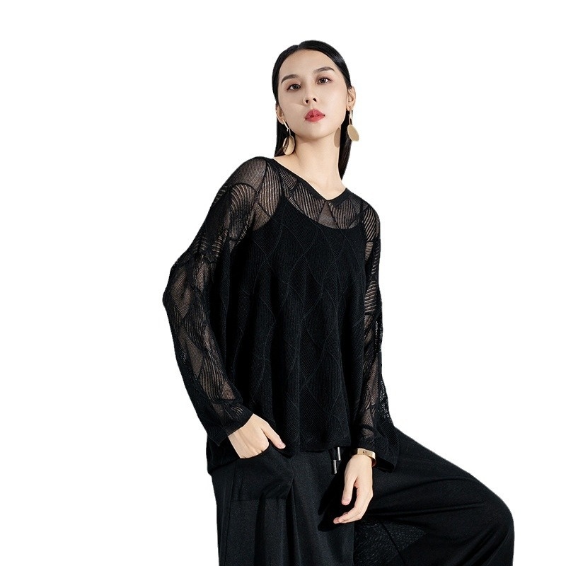 Slightly Plump Women's Clothing V-neck Silk Long-sleeved Knitted Sweater Women's Hollow Cardigan Loose Large Size Top Thin Air-conditioning Shirt