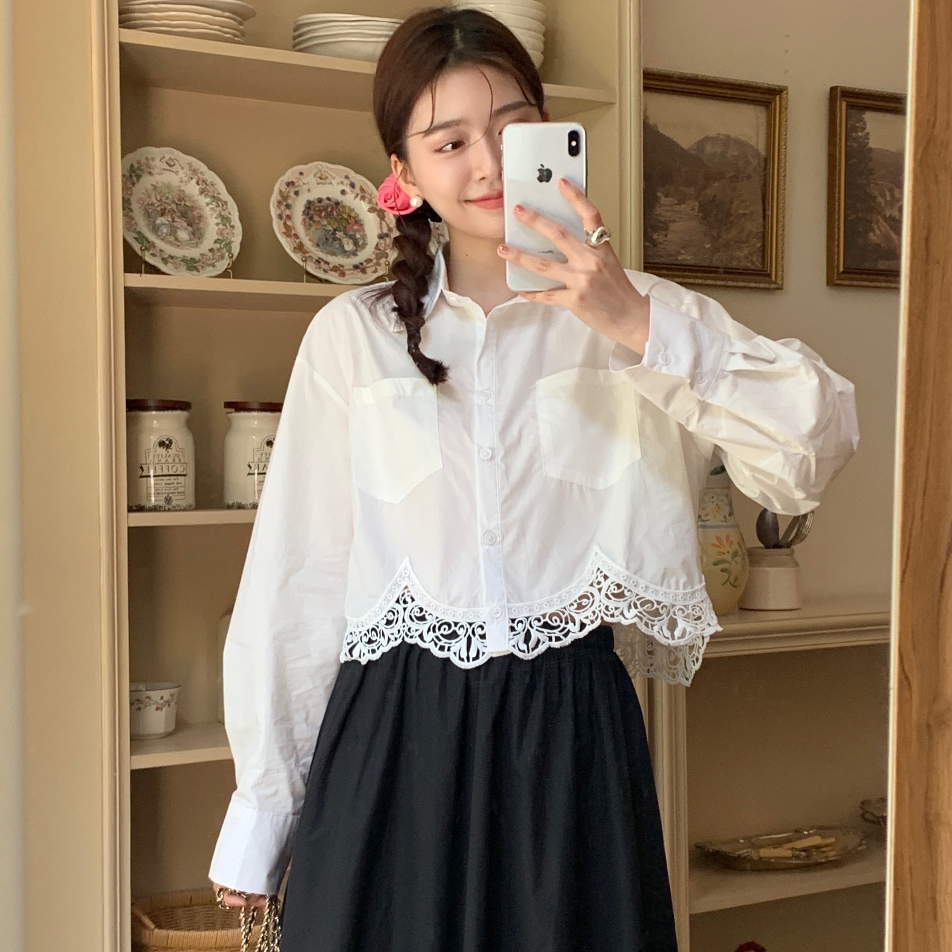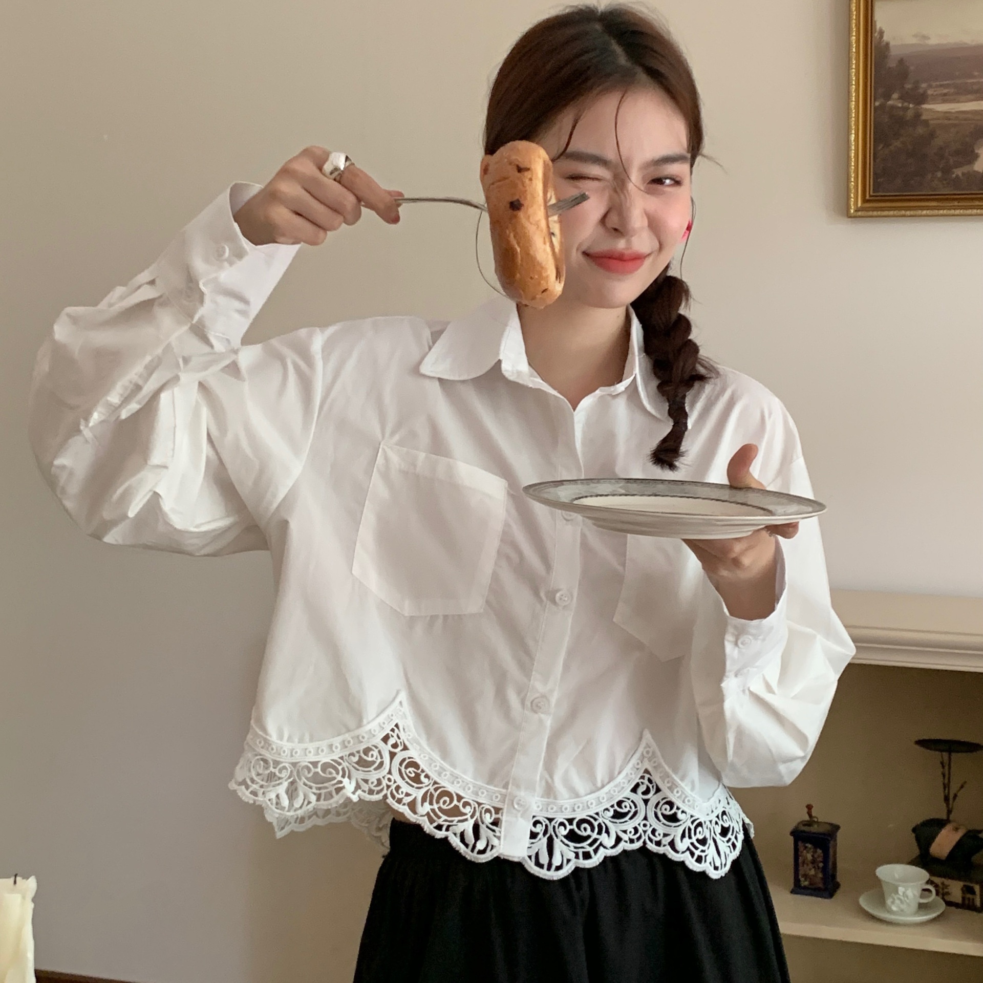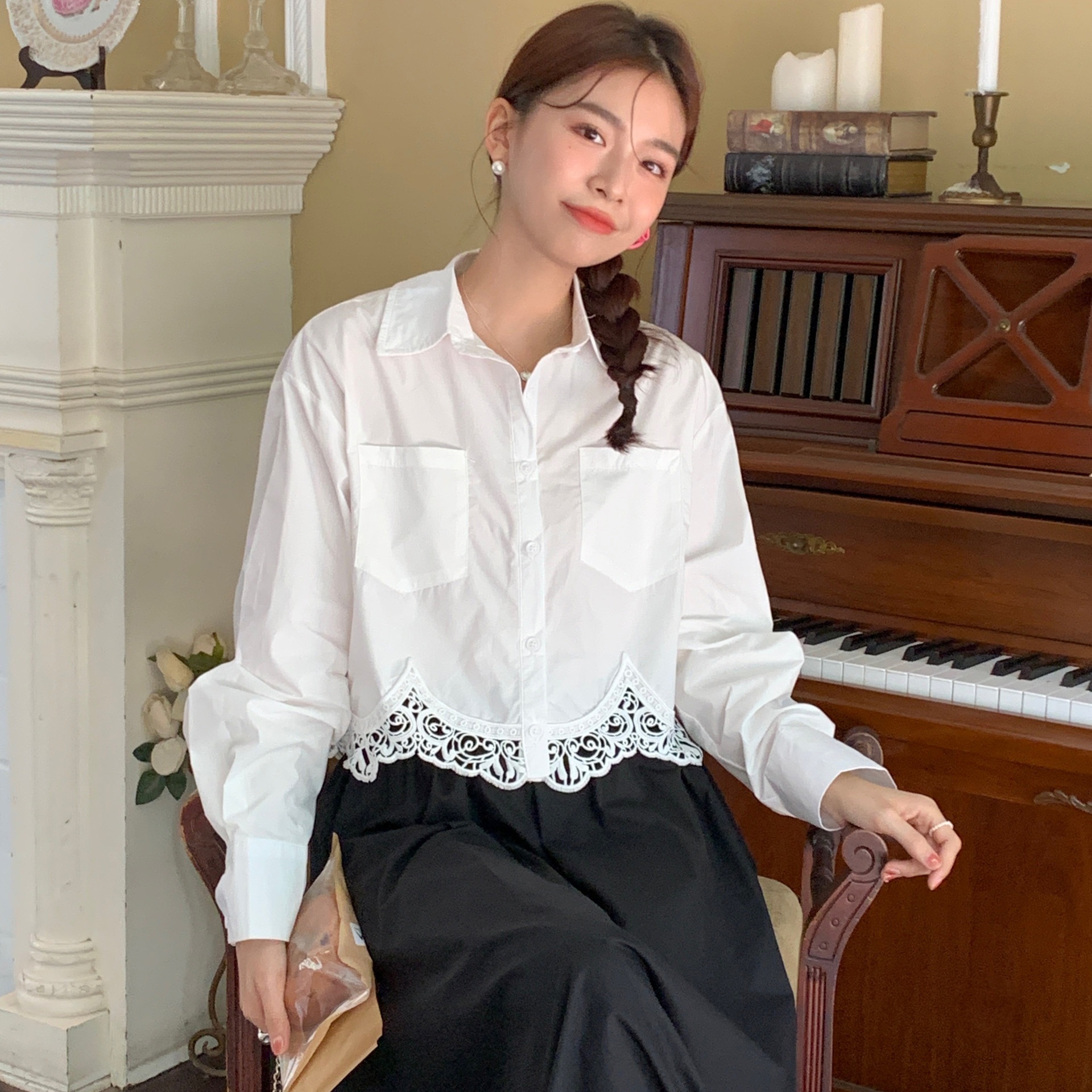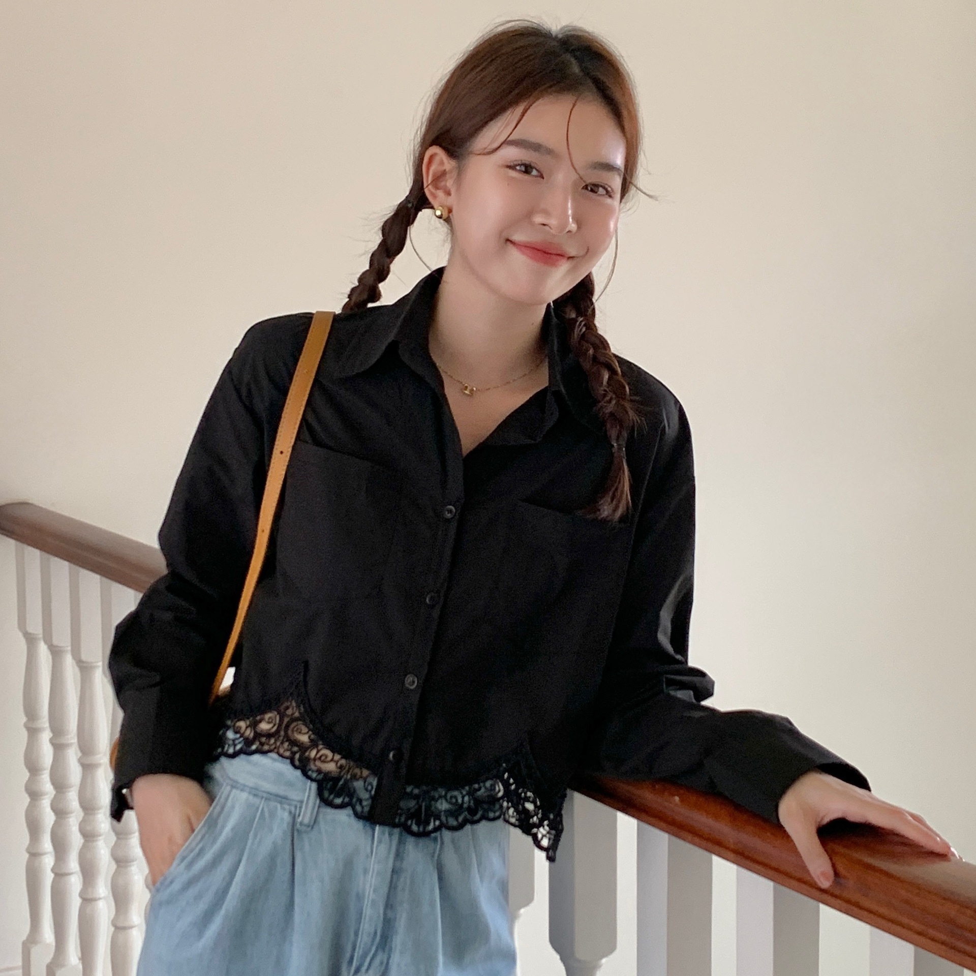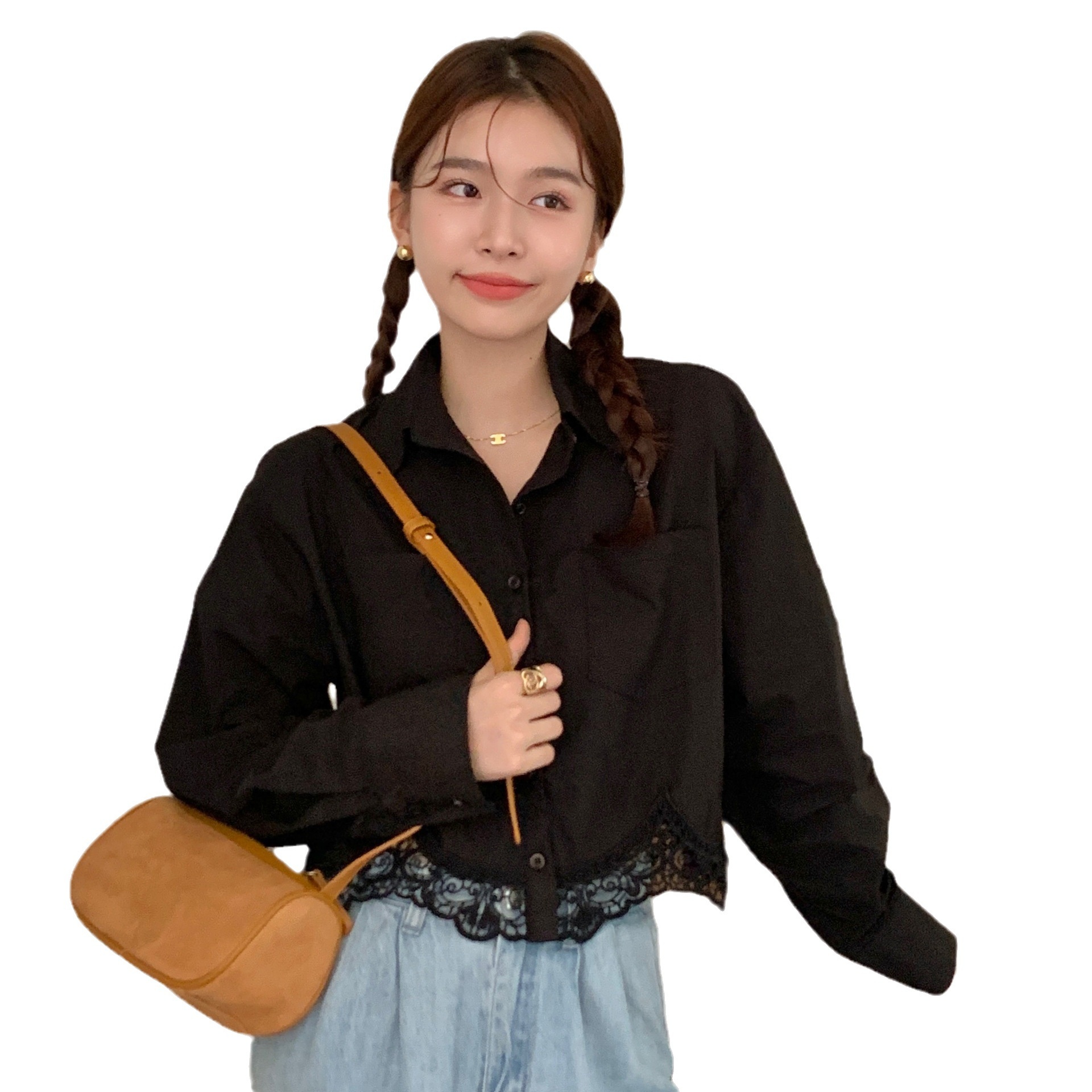 Actual Shot Of Early Autumn Korean Simple Lace Stitching Solid Color Shirt Long-sleeved Women's Clothing