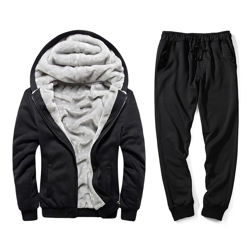 Men's Youth Autumn And Winter Plus Velvet Thickened Solid Color Hooded Jacket Casual Sports Trousers Loose Two-piece Suit